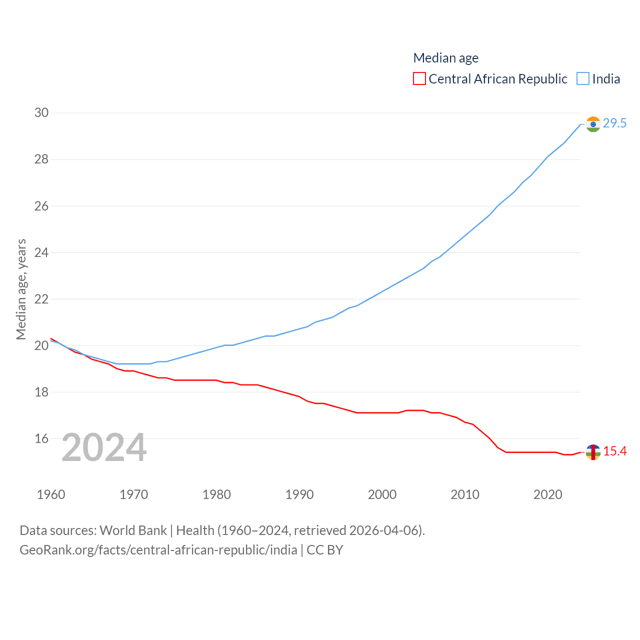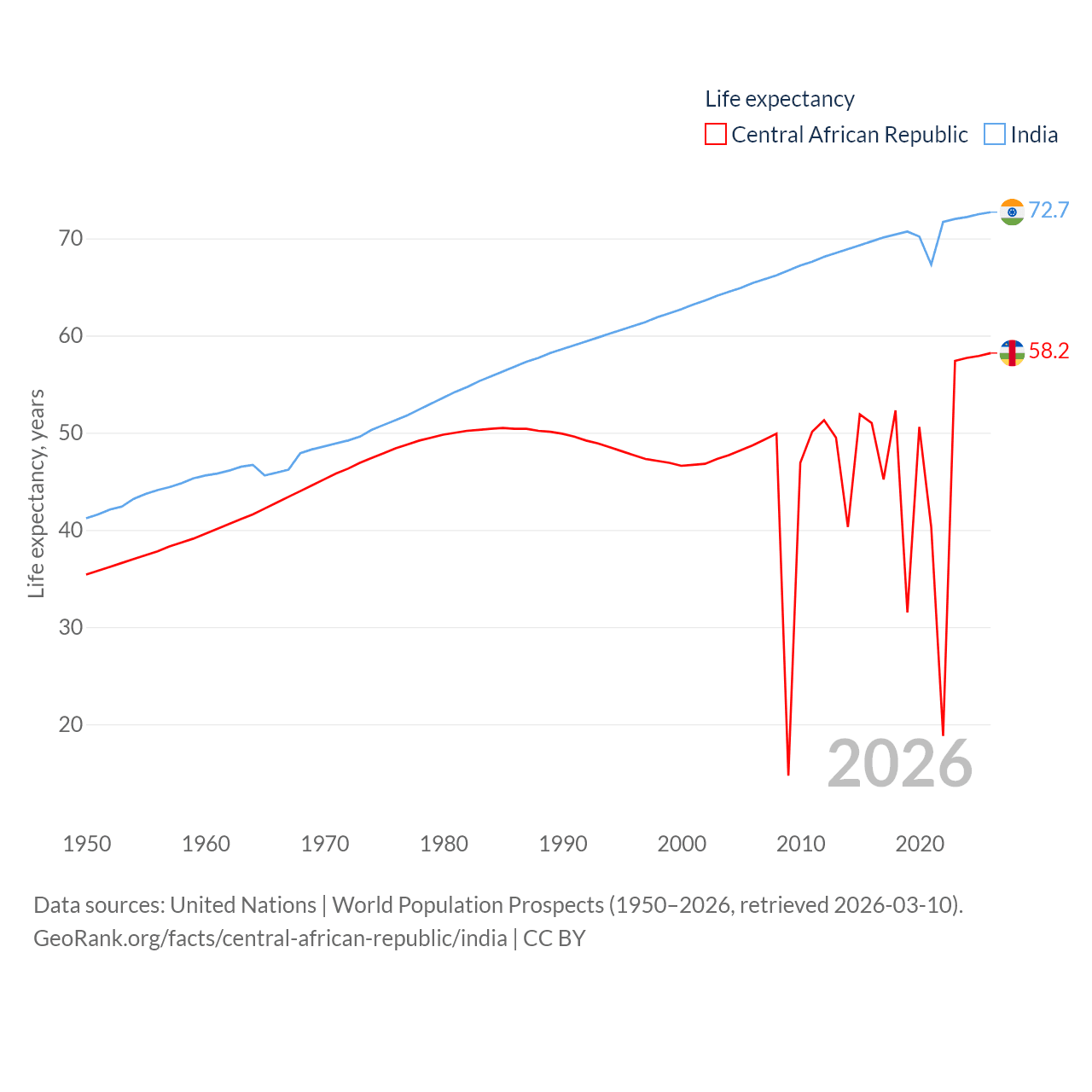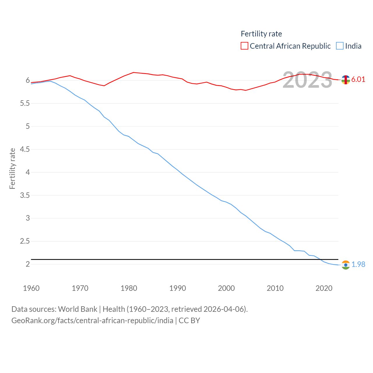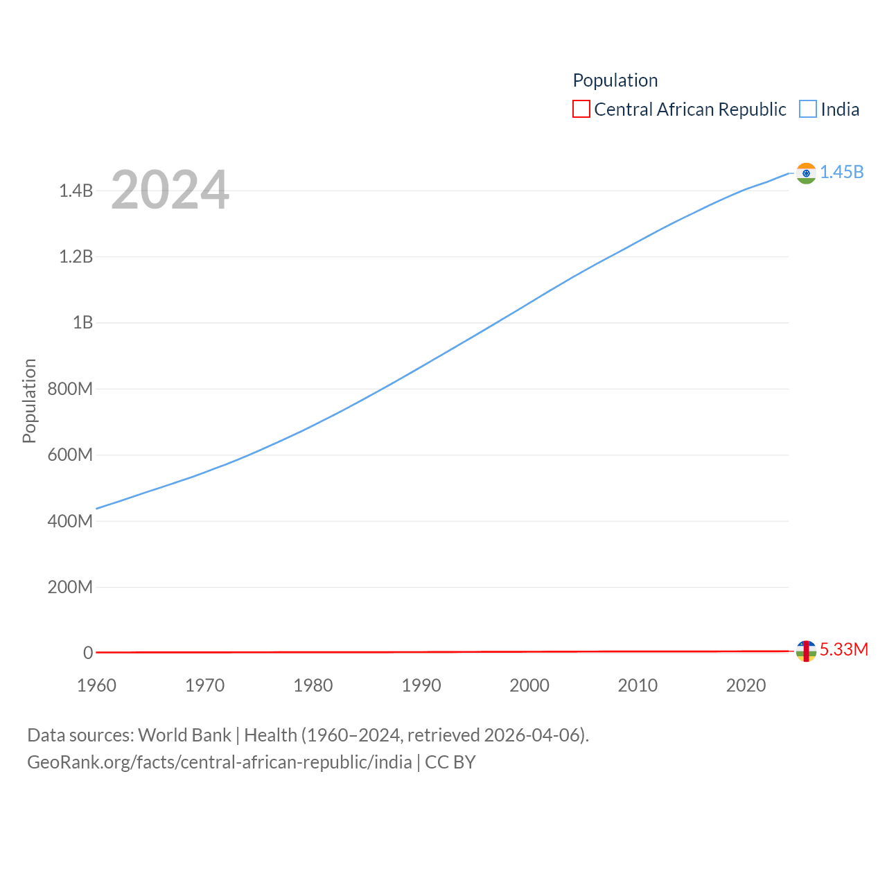 The Central African Republic has a population of 5.33M (ranked 121/197), compared with 1.45B in India (ranked 1/197). The Central African Republic's land area is 240,534 sq mi versus 1,147,955 sq mi for India (ranked 43rd vs. 7th).