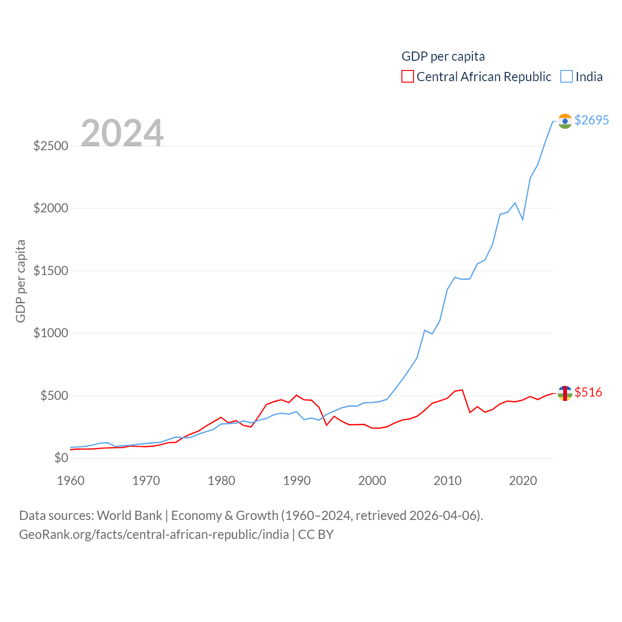 By GDP, The Central African Republic ranks 171/197 ($2.75B) and India ranks 5/197 ($3.91T). By GDP per capita, The Central African Republic ranks 195/197 ($516), while India ranks 143/197 ($2,695).