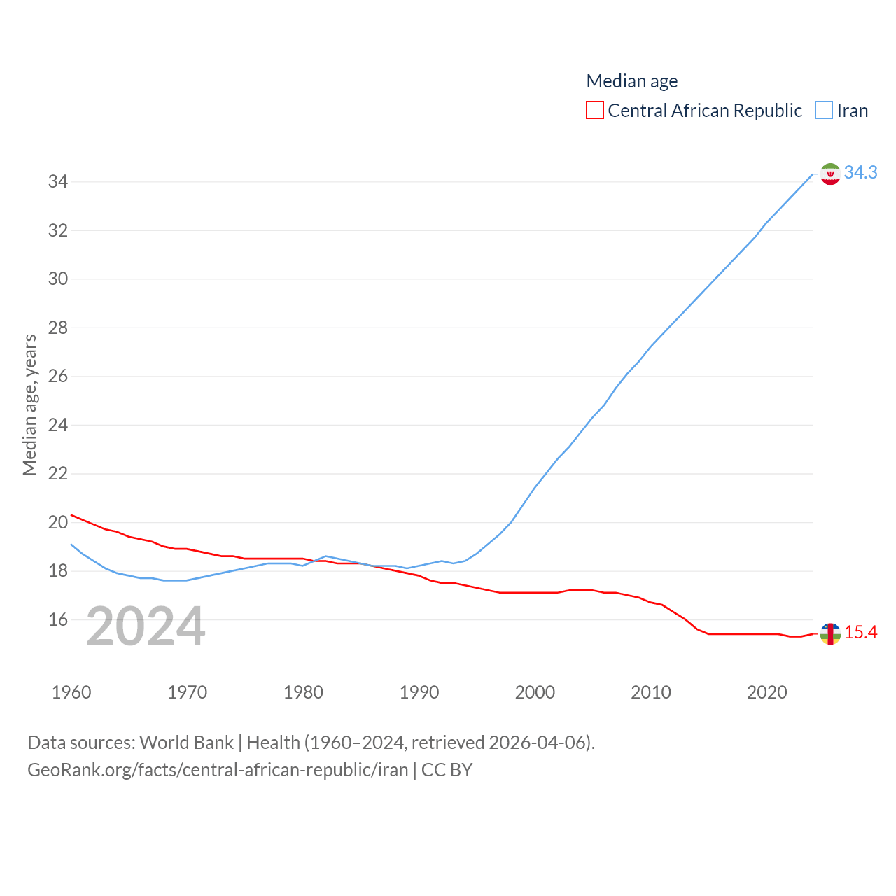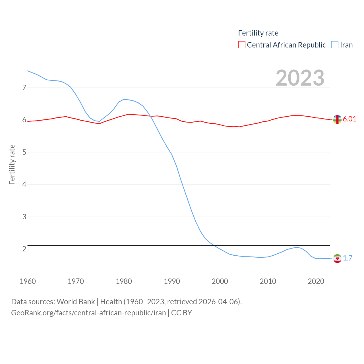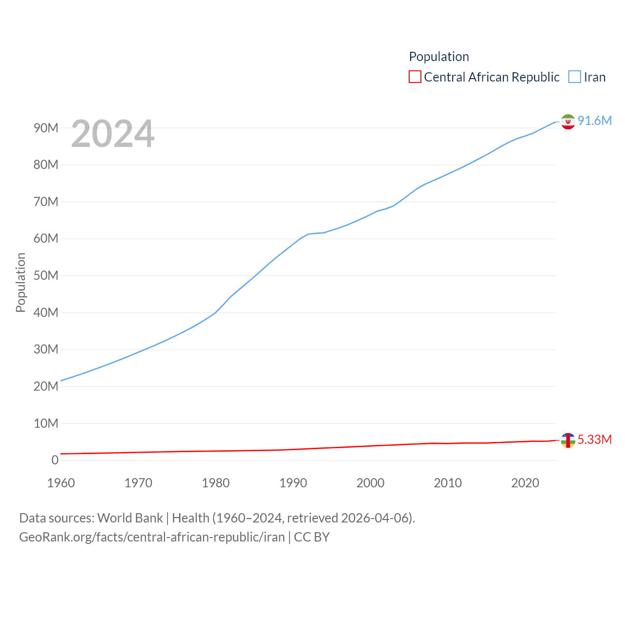 The Central African Republic has a population of 5.33M (ranked 121/197), compared with 91.6M in Iran (ranked 17/197). The Central African Republic's land area is 240,534 sq mi versus 626,451 sq mi for Iran (ranked 43rd vs. 17th).
