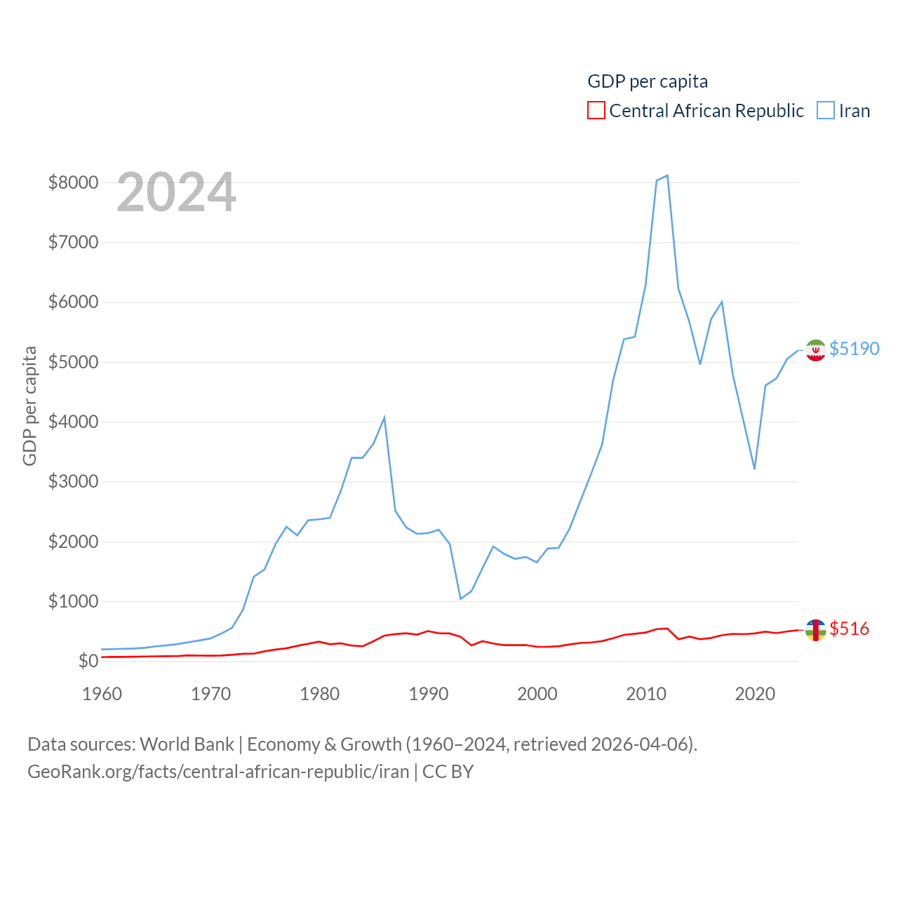 By GDP, The Central African Republic ranks 171/197 ($2.75B) and Iran ranks 34/197 ($475B). By GDP per capita, The Central African Republic ranks 195/197 ($516), while Iran ranks 119/197 ($5,190).