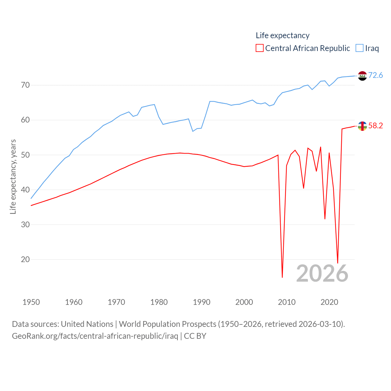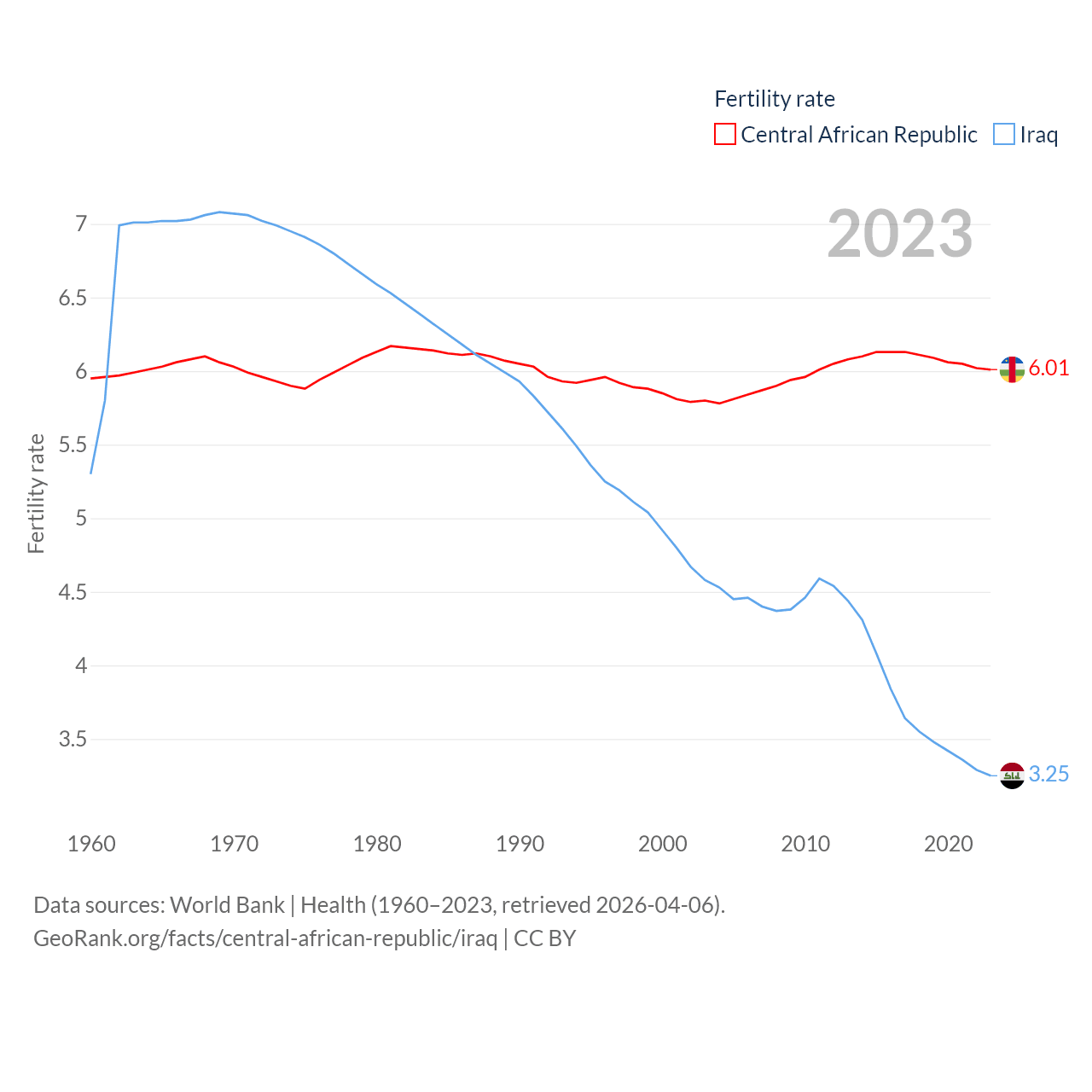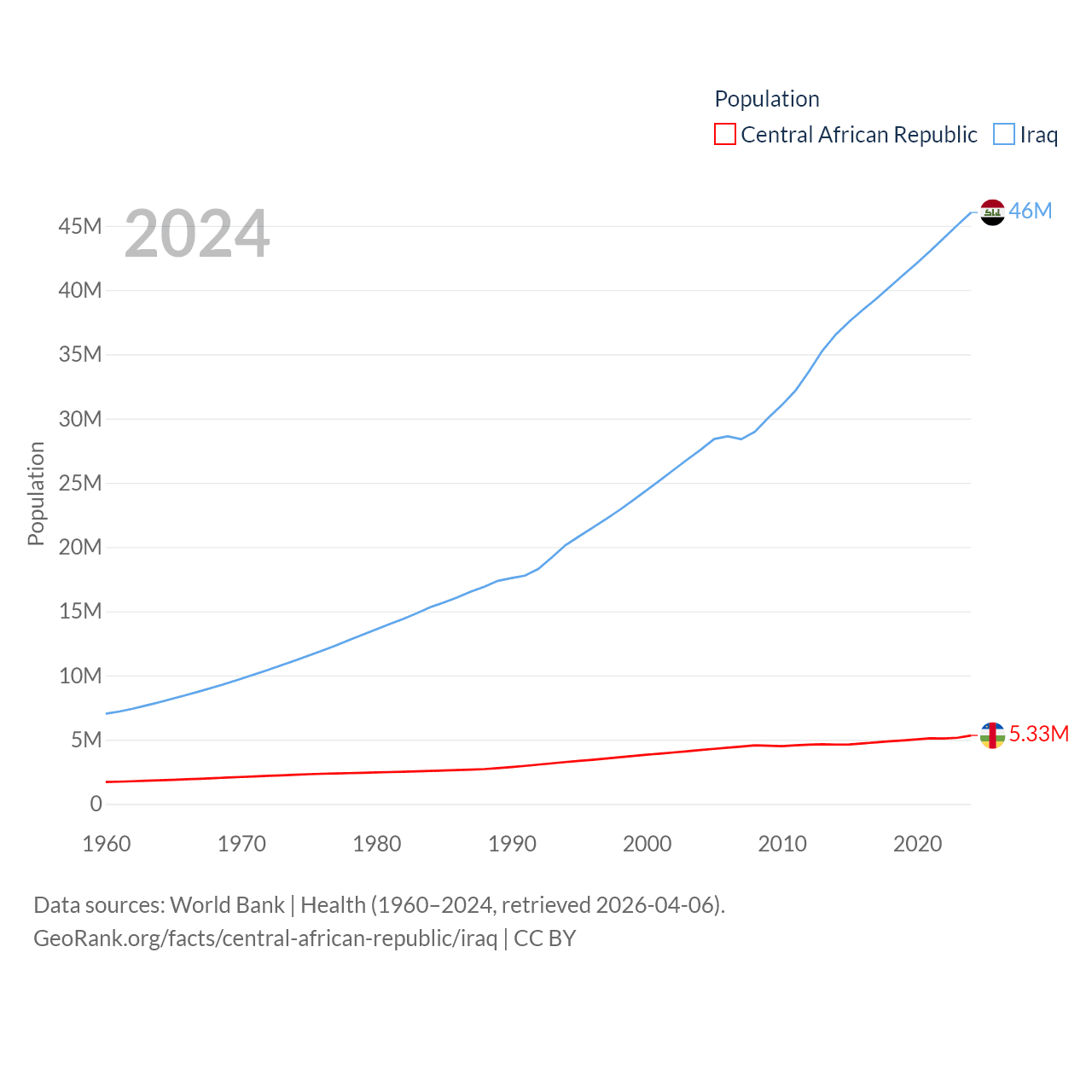 The Central African Republic has a population of 5.33M (ranked 121/197), compared with 46M in Iraq (ranked 34/197). The Central African Republic's land area is 240,534 sq mi versus 167,619 sq mi for Iraq (ranked 43rd vs. 57th).