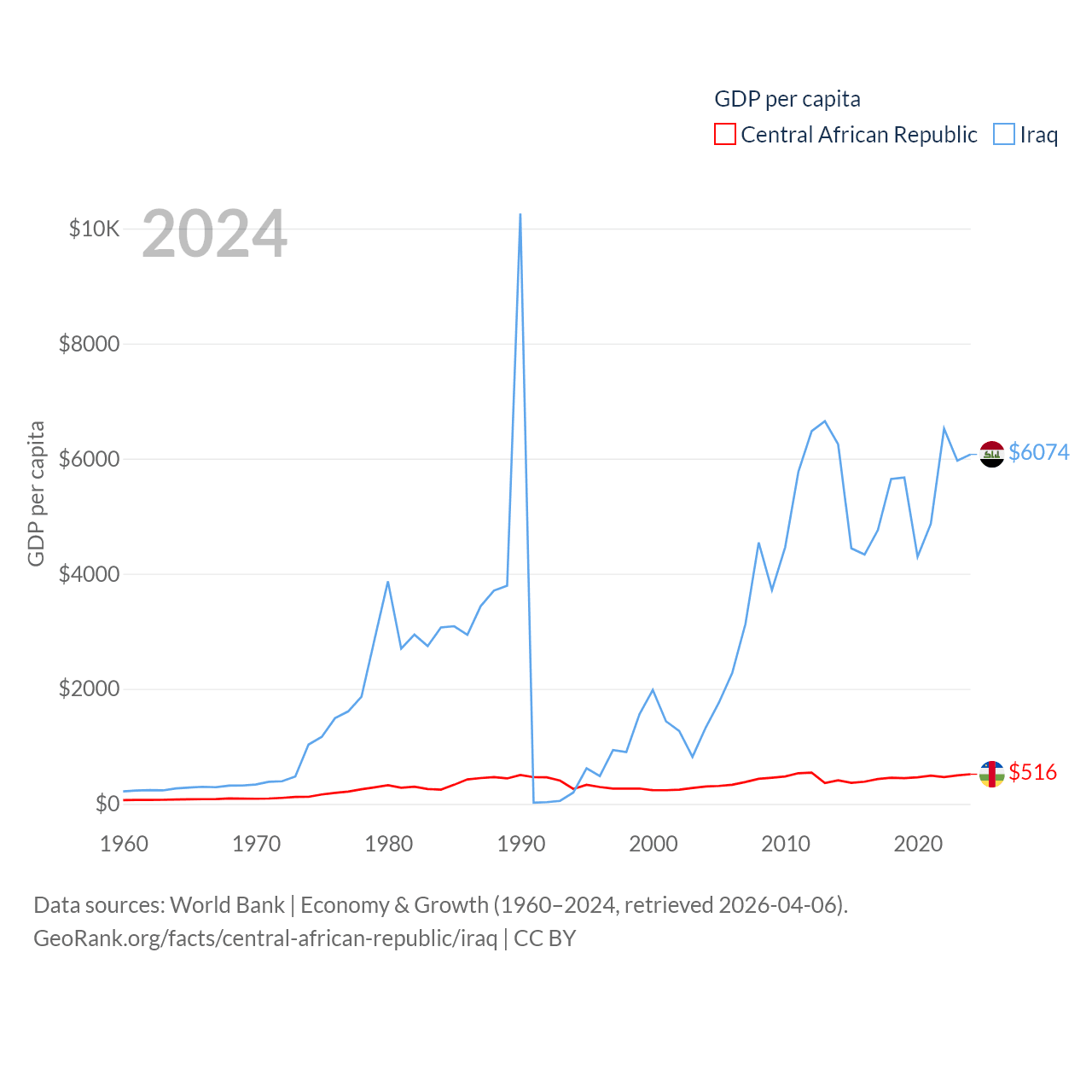 By GDP, The Central African Republic ranks 171/197 ($2.75B) and Iraq ranks 50/197 ($280B). By GDP per capita, The Central African Republic ranks 195/197 ($516), while Iraq ranks 113/197 ($6,074).