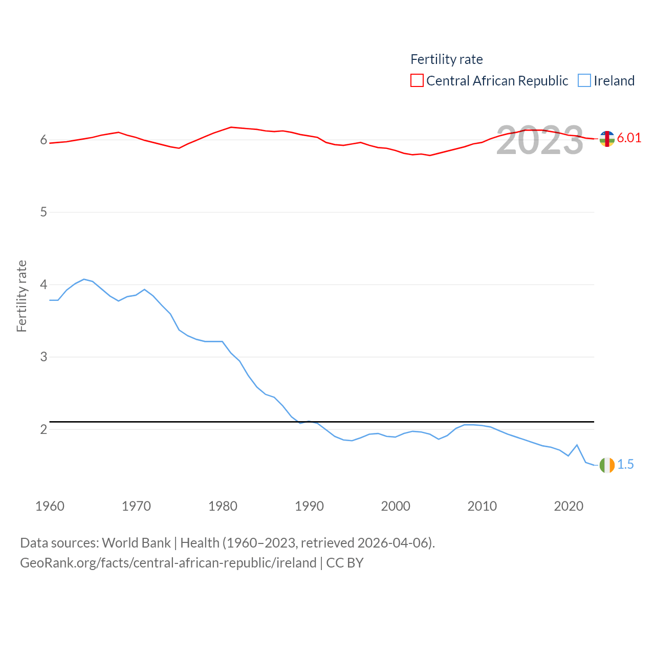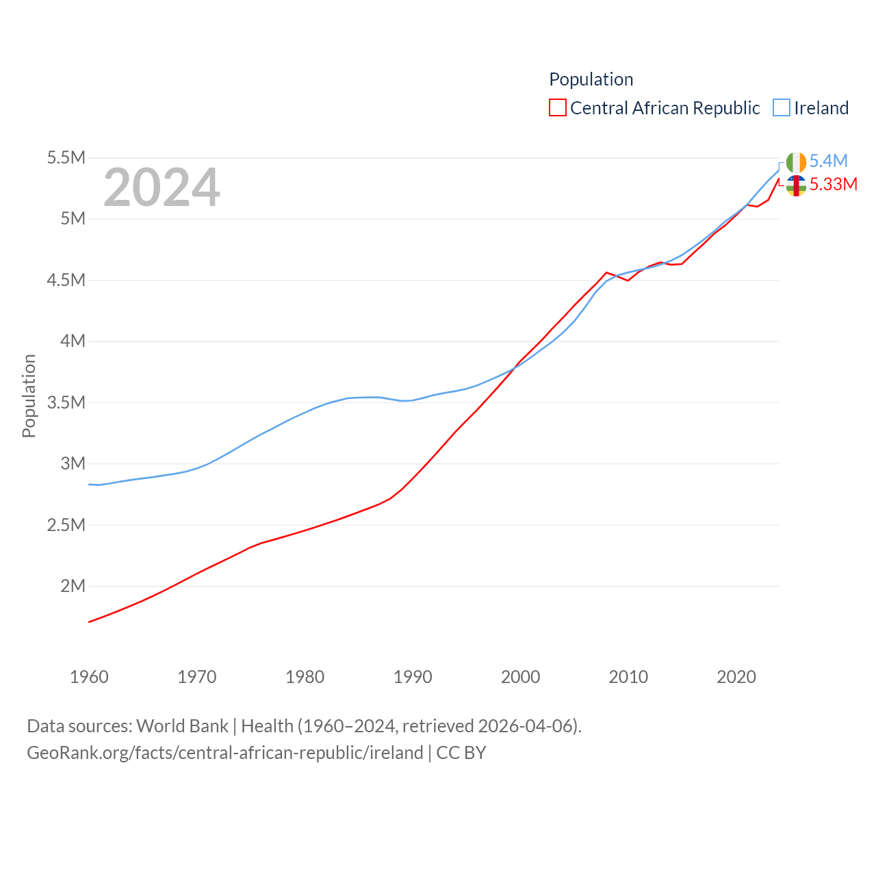 The Central African Republic has a population of 5.33M (ranked 121/197), compared with 5.4M in Ireland (ranked 120/197). The Central African Republic's land area is 240,534 sq mi versus 26,599 sq mi for Ireland (ranked 43rd vs. 119th).