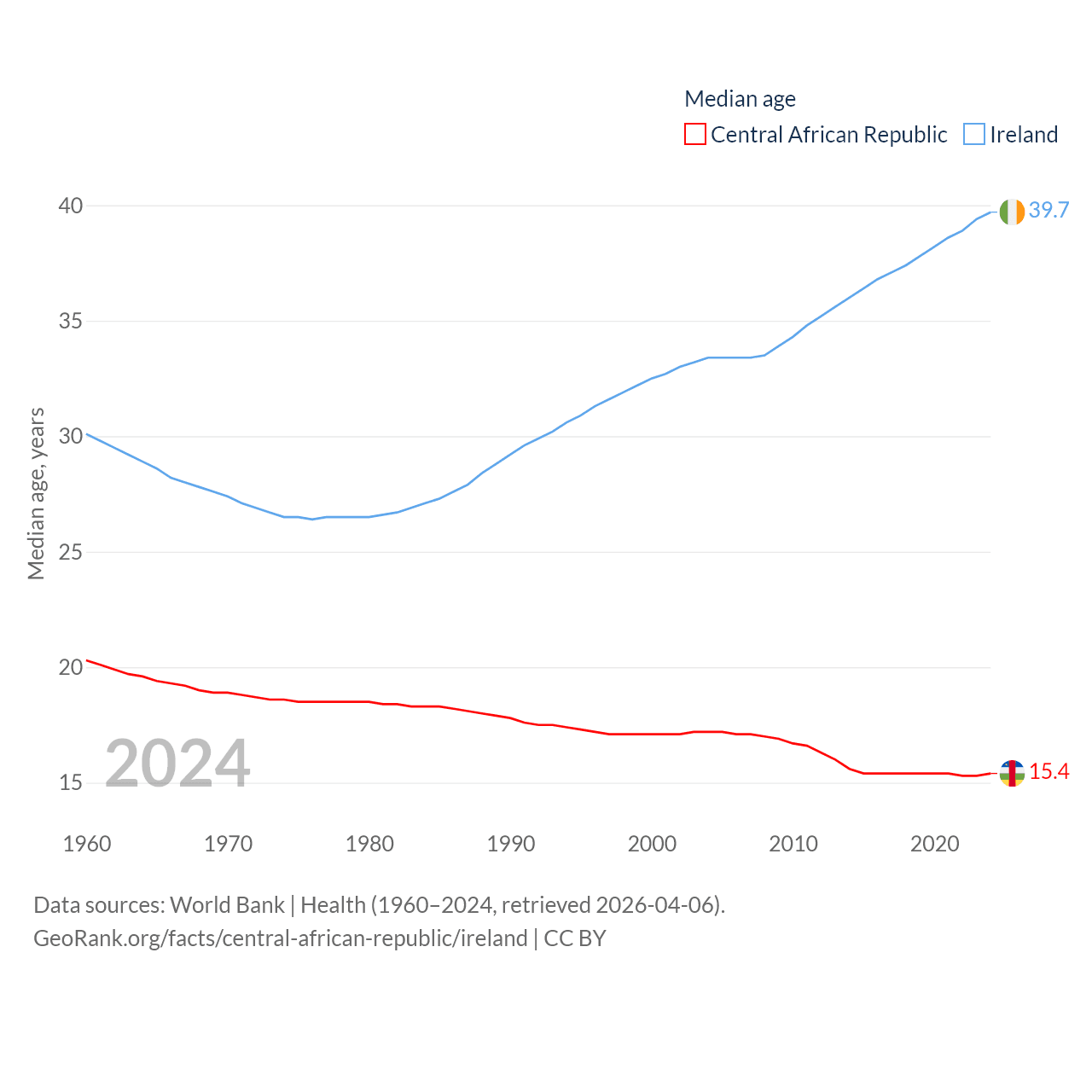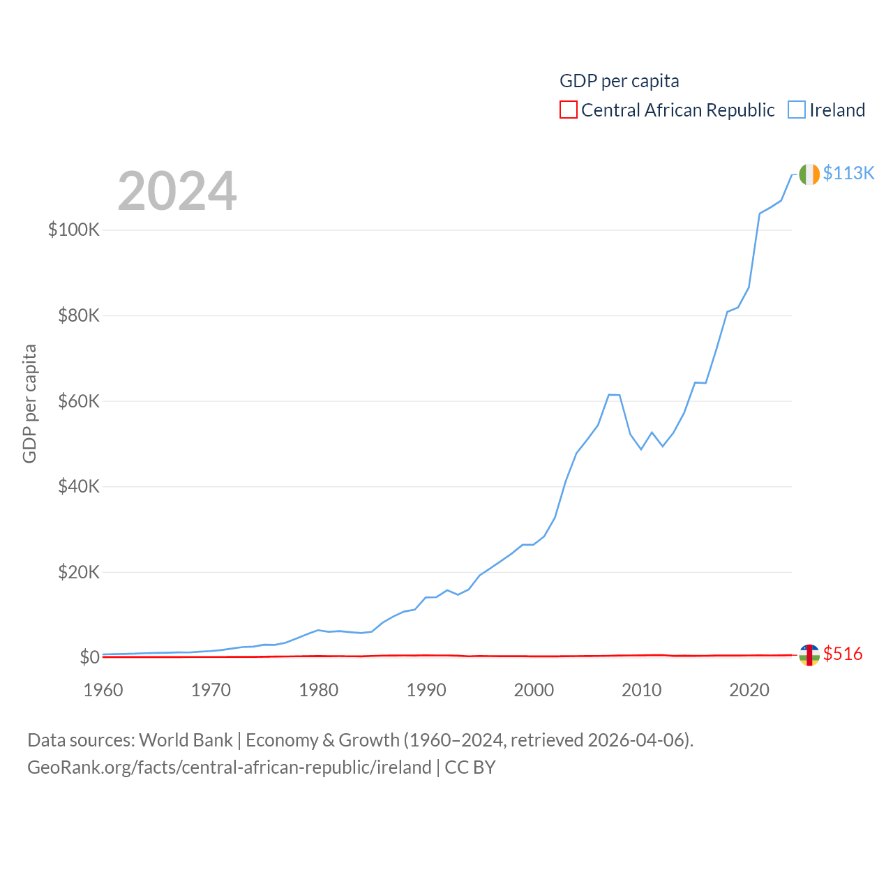 By GDP, The Central African Republic ranks 171/197 ($2.75B) and Ireland ranks 25/197 ($609B). By GDP per capita, The Central African Republic ranks 195/197 ($516), while Ireland ranks 4/197 ($112,895).