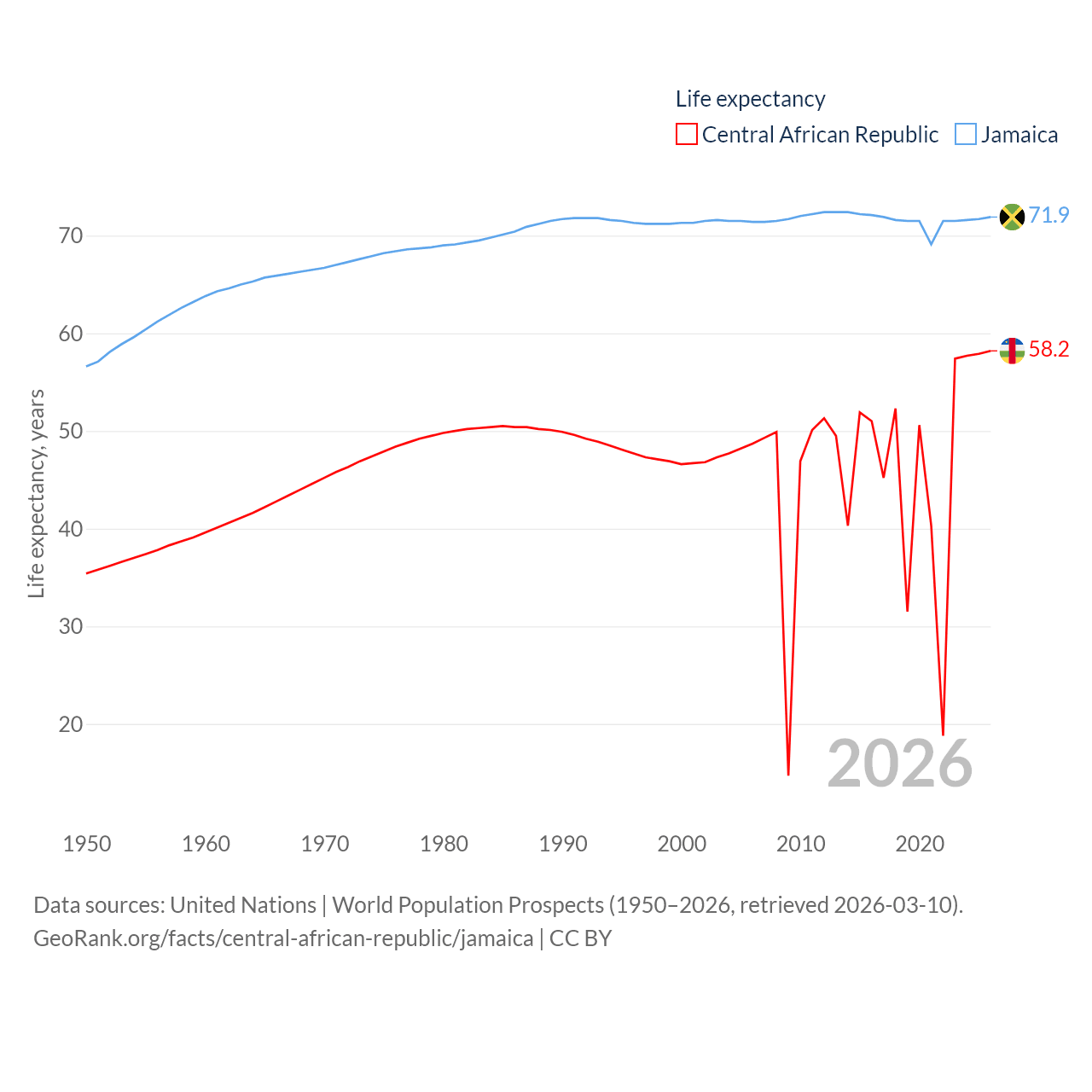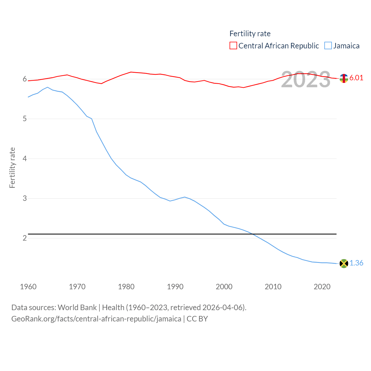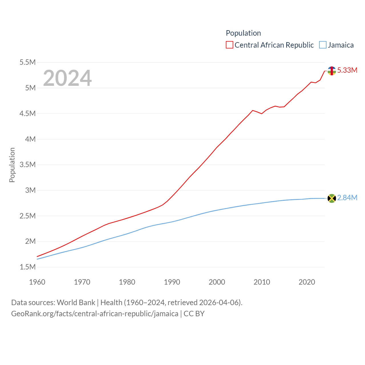 The Central African Republic has a population of 5.33M (ranked 121/197), compared with 2.84M in Jamaica (ranked 139/197). The Central African Republic's land area is 240,534 sq mi versus 4,181 sq mi for Jamaica (ranked 43rd vs. 159th).