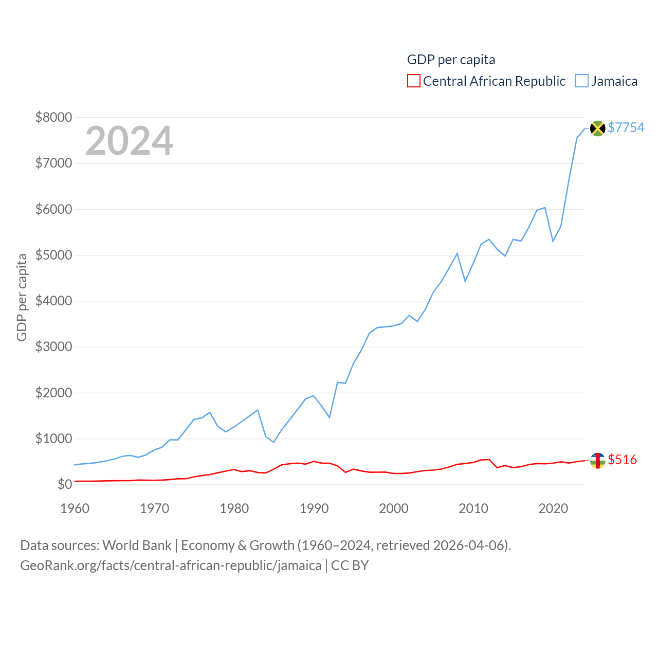 By GDP, The Central African Republic ranks 171/197 ($2.75B) and Jamaica ranks 124/197 ($22B). By GDP per capita, The Central African Republic ranks 195/197 ($516), while Jamaica ranks 95/197 ($7,754).