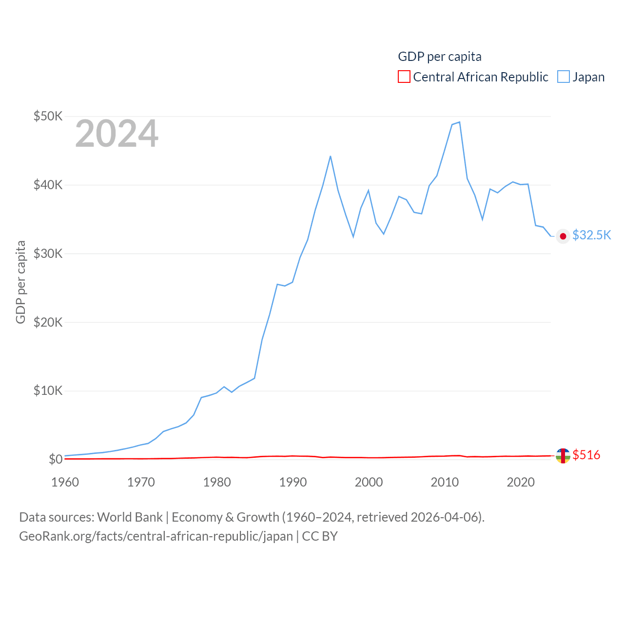 By GDP, The Central African Republic ranks 171/197 ($2.75B) and Japan ranks 4/197 ($4.03T). By GDP per capita, The Central African Republic ranks 195/197 ($516), while Japan ranks 38/197 ($32,487).