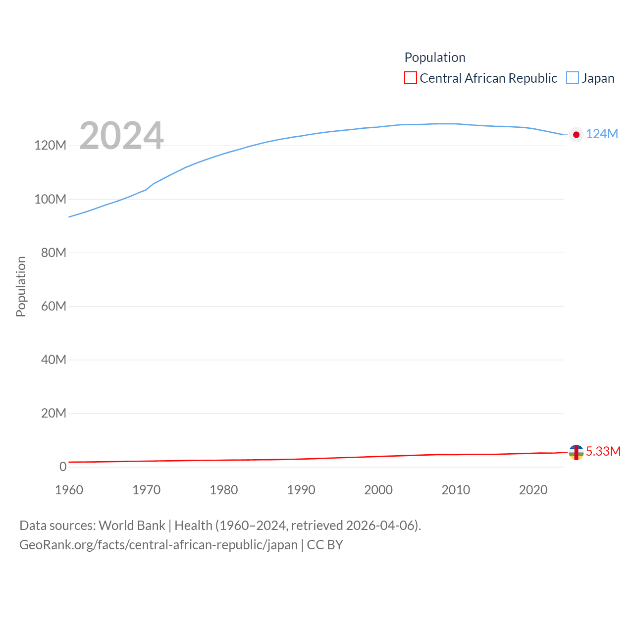 The Central African Republic has a population of 5.33M (ranked 121/197), compared with 124M in Japan (ranked 12/197). The Central African Republic's land area is 240,534 sq mi versus 140,761 sq mi for Japan (ranked 43rd vs. 61st).