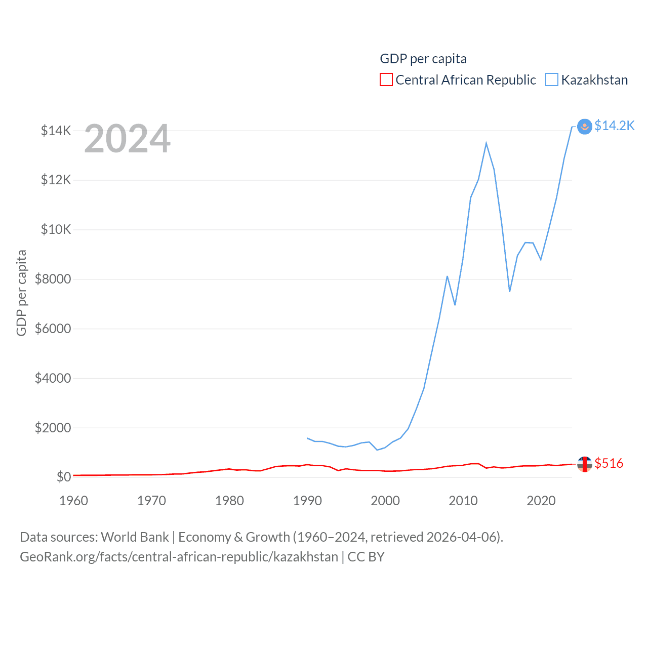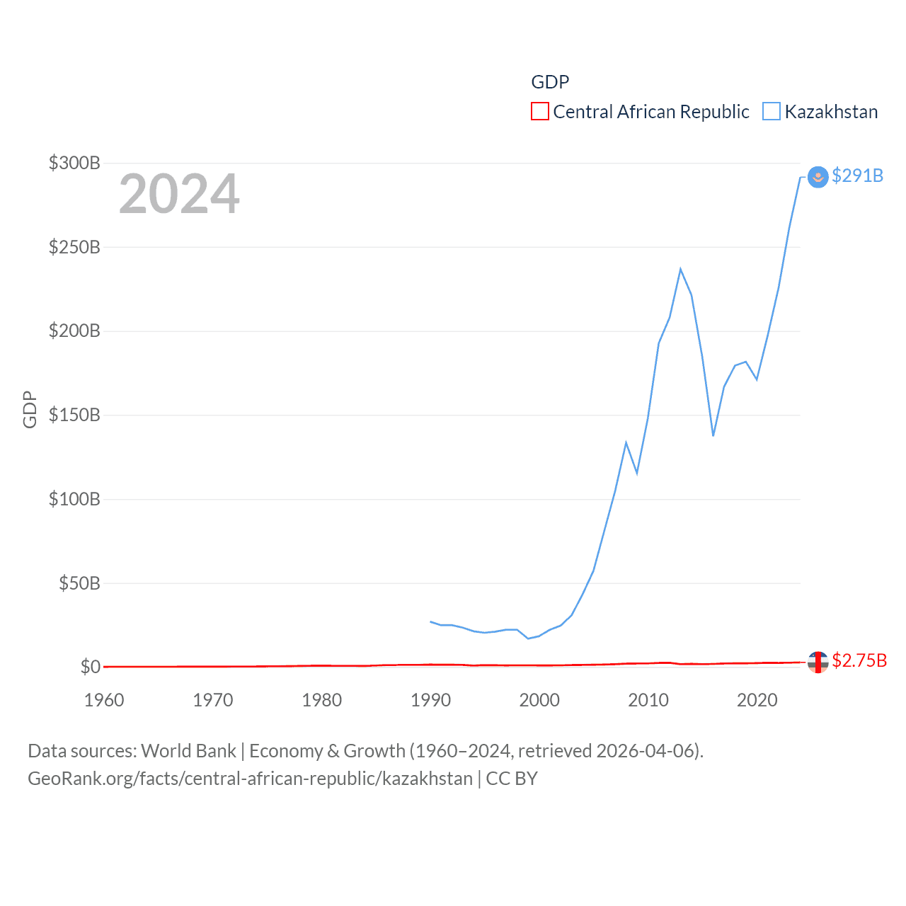 By GDP, The Central African Republic ranks 171/197 ($2.75B) and Kazakhstan ranks 48/197 ($291B). By GDP per capita, The Central African Republic ranks 195/197 ($516), while Kazakhstan ranks 71/197 ($14,155).