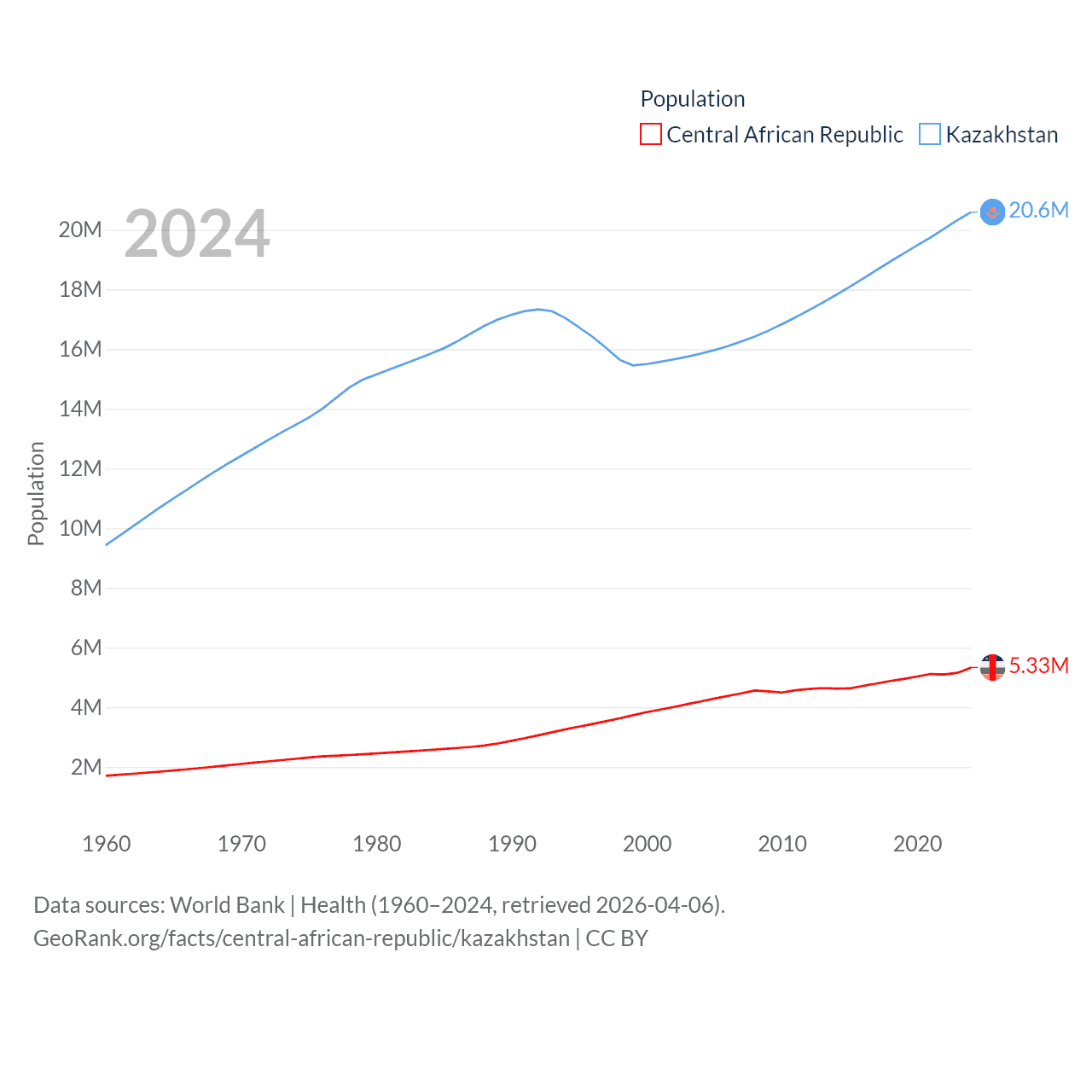 The Central African Republic has a population of 5.33M (ranked 121/197), compared with 20.6M in Kazakhstan (ranked 64/197). The Central African Republic's land area is 240,534 sq mi versus 1,042,360 sq mi for Kazakhstan (ranked 43rd vs. 9th).