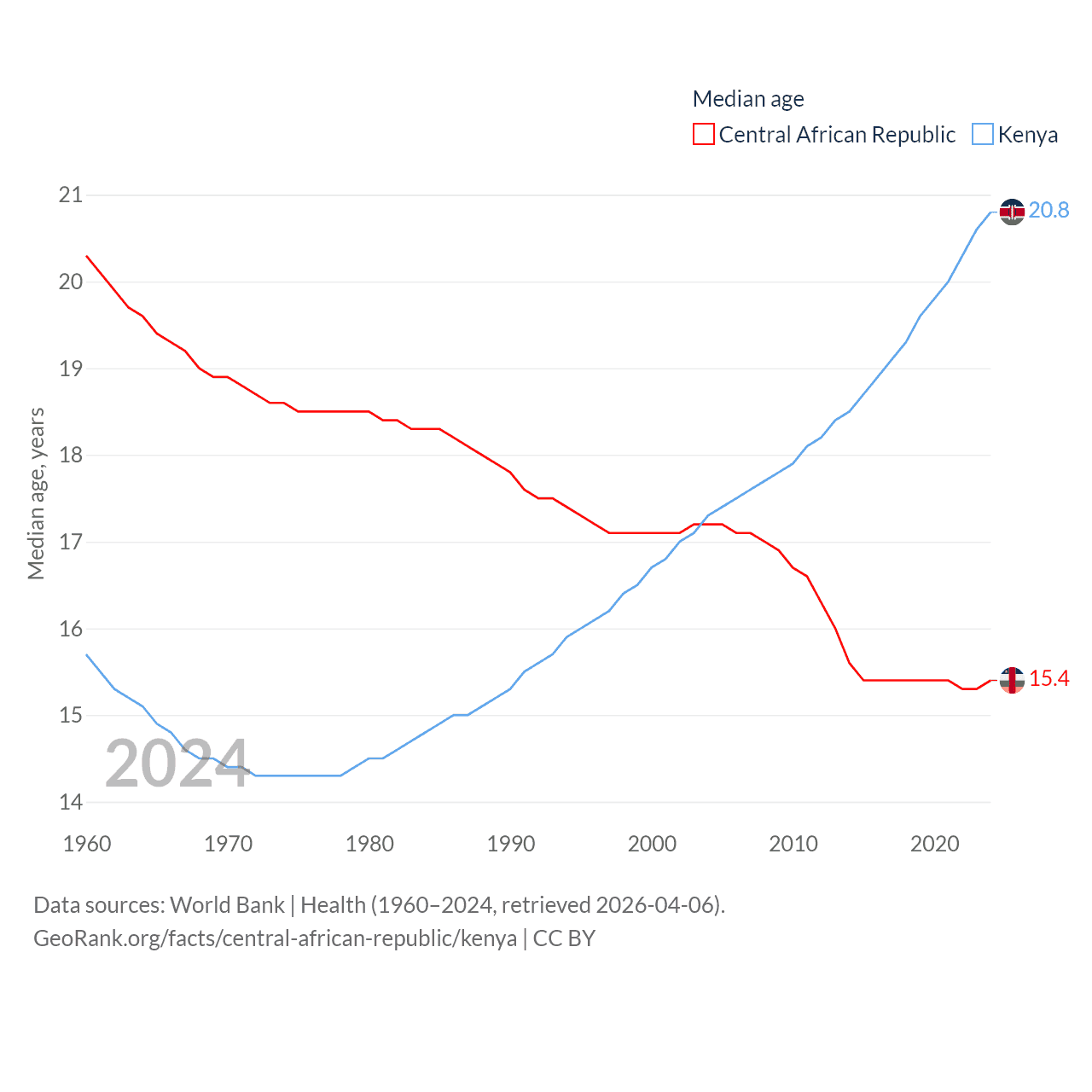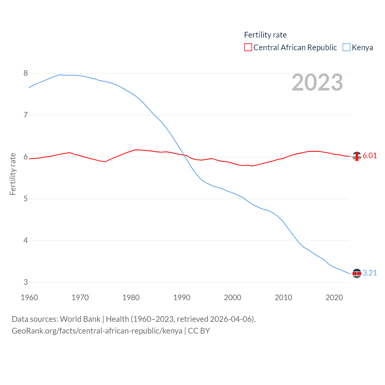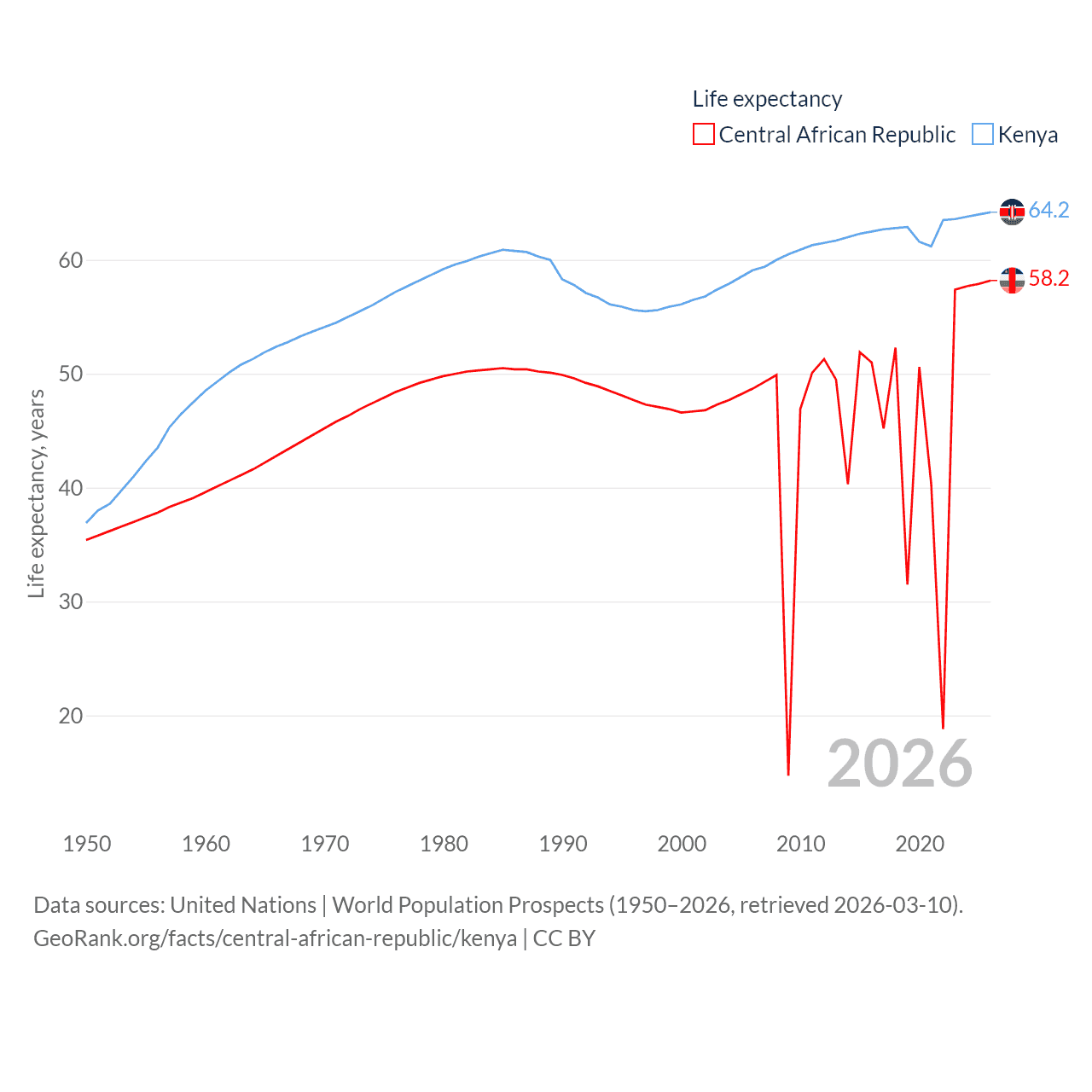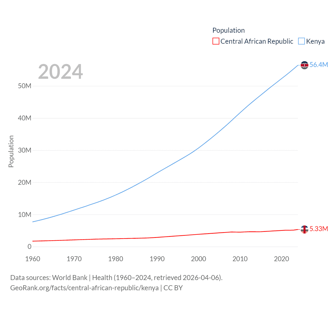 The Central African Republic has a population of 5.33M (ranked 121/197), compared with 56.4M in Kenya (ranked 26/197). The Central African Republic's land area is 240,534 sq mi versus 224,278 sq mi for Kenya (ranked 43rd vs. 45th).