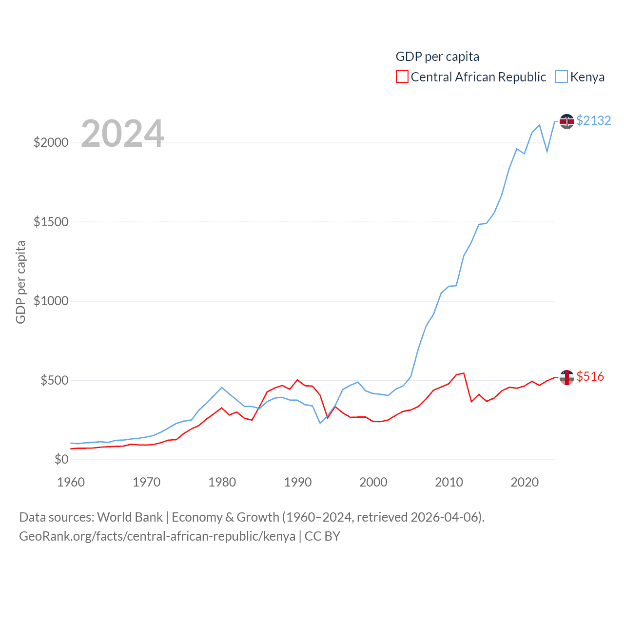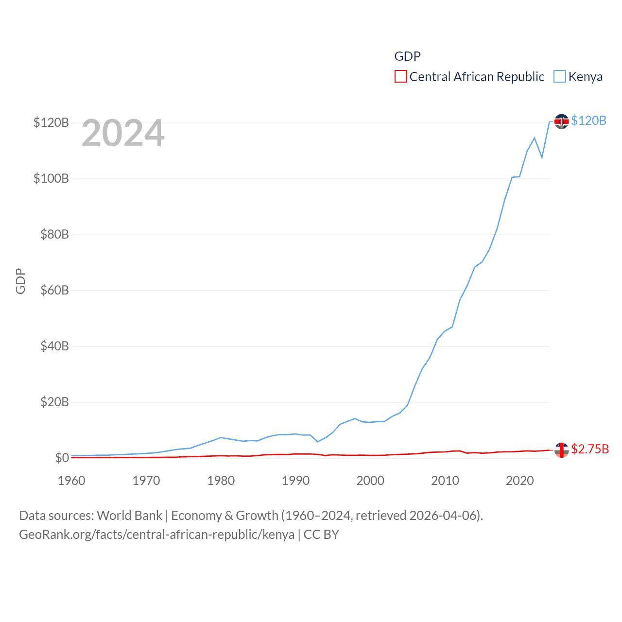 By GDP, The Central African Republic ranks 171/197 ($2.75B) and Kenya ranks 64/197 ($120B). By GDP per capita, The Central African Republic ranks 195/197 ($516), while Kenya ranks 154/197 ($2,132).