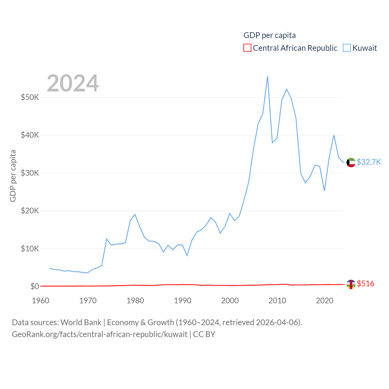 By GDP, The Central African Republic ranks 171/197 ($2.75B) and Kuwait ranks 59/197 ($160B). By GDP per capita, The Central African Republic ranks 195/197 ($516), while Kuwait ranks 37/197 ($32,718).