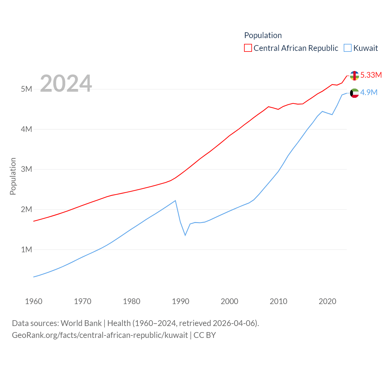 The Central African Republic has a population of 5.33M (ranked 121/197), compared with 4.9M in Kuwait (ranked 127/197). The Central African Republic's land area is 240,534 sq mi versus 6,880 sq mi for Kuwait (ranked 43rd vs. 153rd).