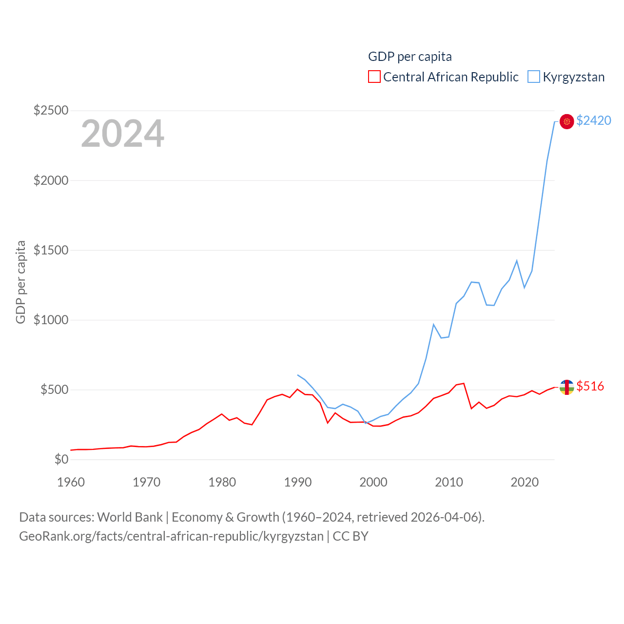 By GDP, The Central African Republic ranks 171/197 ($2.75B) and Kyrgyzstan ranks 135/197 ($17.5B). By GDP per capita, The Central African Republic ranks 195/197 ($516), while Kyrgyzstan ranks 150/197 ($2,420).