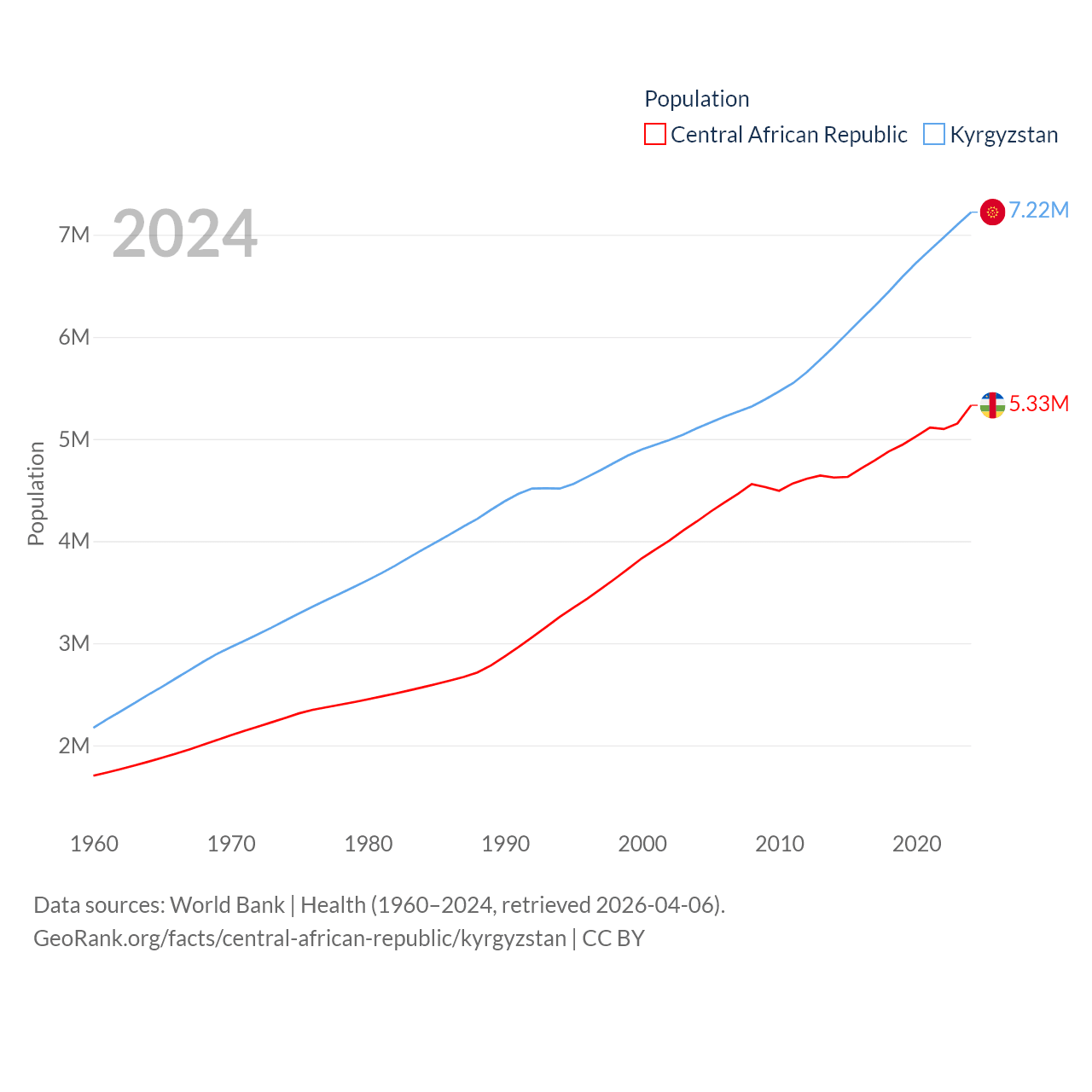 The Central African Republic has a population of 5.33M (ranked 121/197), compared with 7.22M in Kyrgyzstan (ranked 106/197). The Central African Republic's land area is 240,534 sq mi versus 74,054 sq mi for Kyrgyzstan (ranked 43rd vs. 86th).