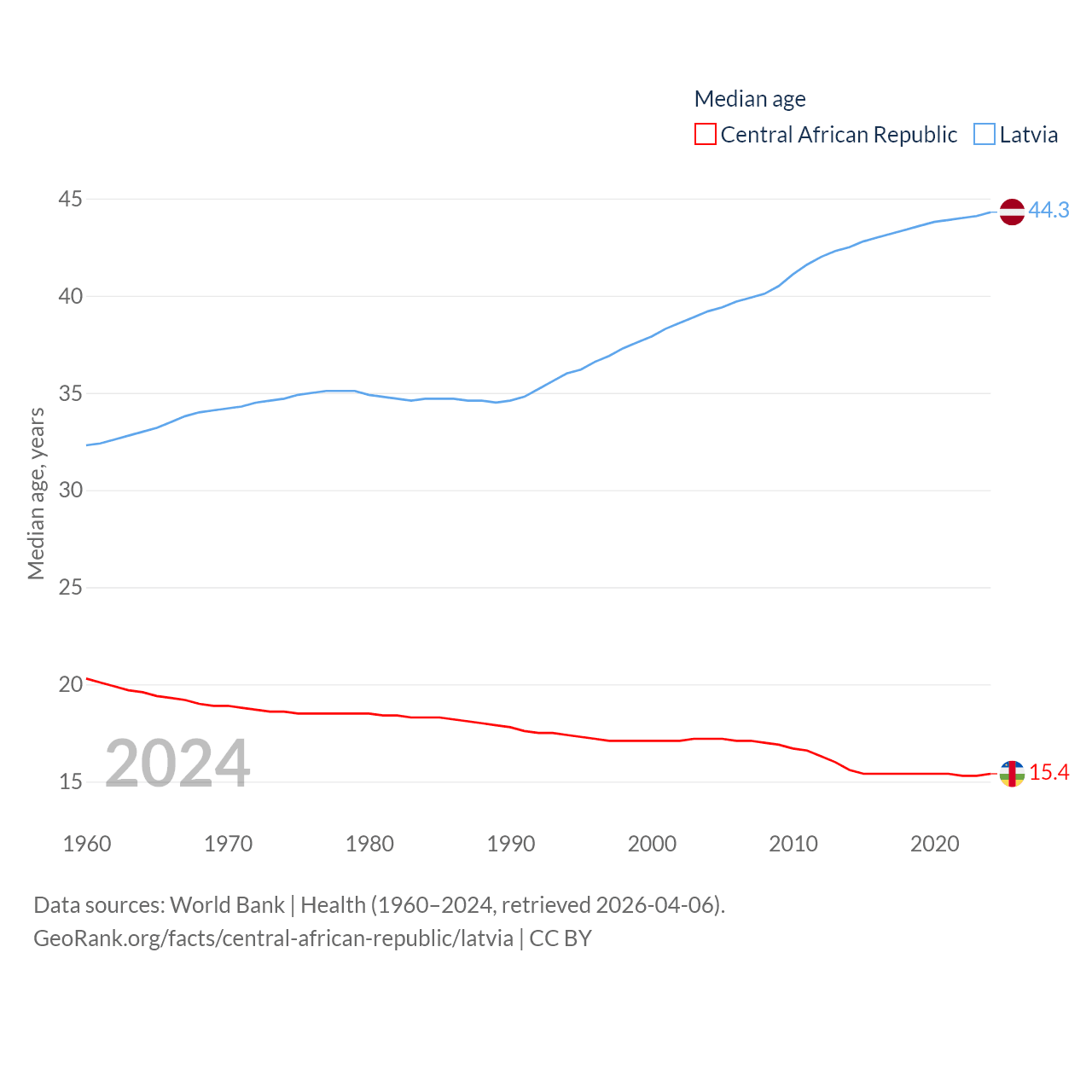 The Central African Republic has a population of 5.33M (ranked 121/197), compared with 1.87M in Latvia (ranked 149/197). The Central African Republic's land area is 240,534 sq mi versus 24,027 sq mi for Latvia (ranked 43rd vs. 121st).