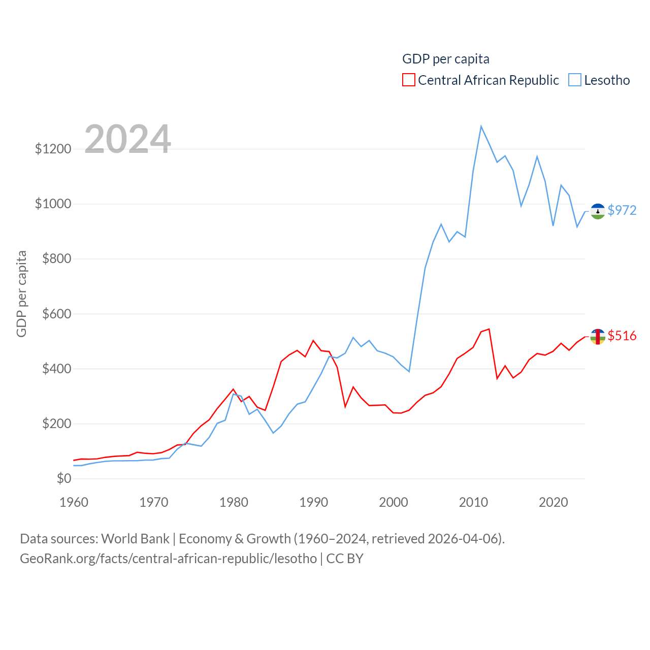 By GDP, The Central African Republic ranks 171/197 ($2.75B) and Lesotho ranks 175/197 ($2.27B). By GDP per capita, The Central African Republic ranks 195/197 ($516), while Lesotho ranks 181/197 ($972).