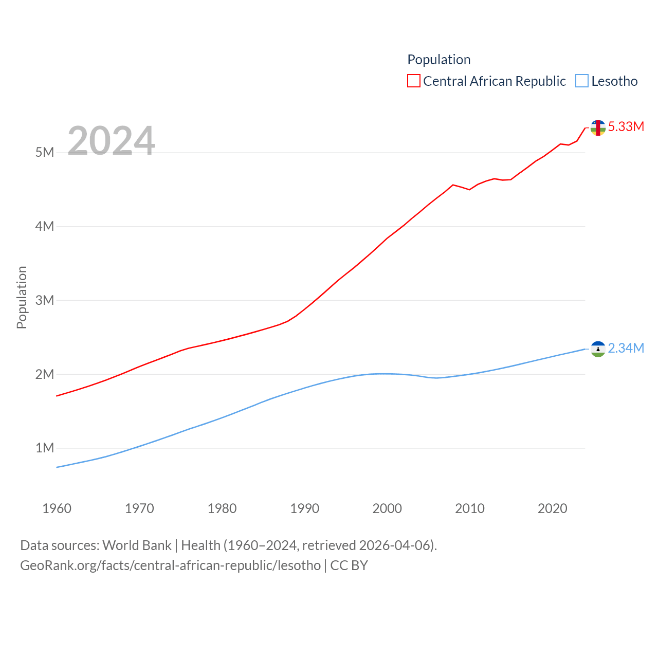 The Central African Republic has a population of 5.33M (ranked 121/197), compared with 2.34M in Lesotho (ranked 145/197). The Central African Republic's land area is 240,534 sq mi versus 11,722 sq mi for Lesotho (ranked 43rd vs. 137th).