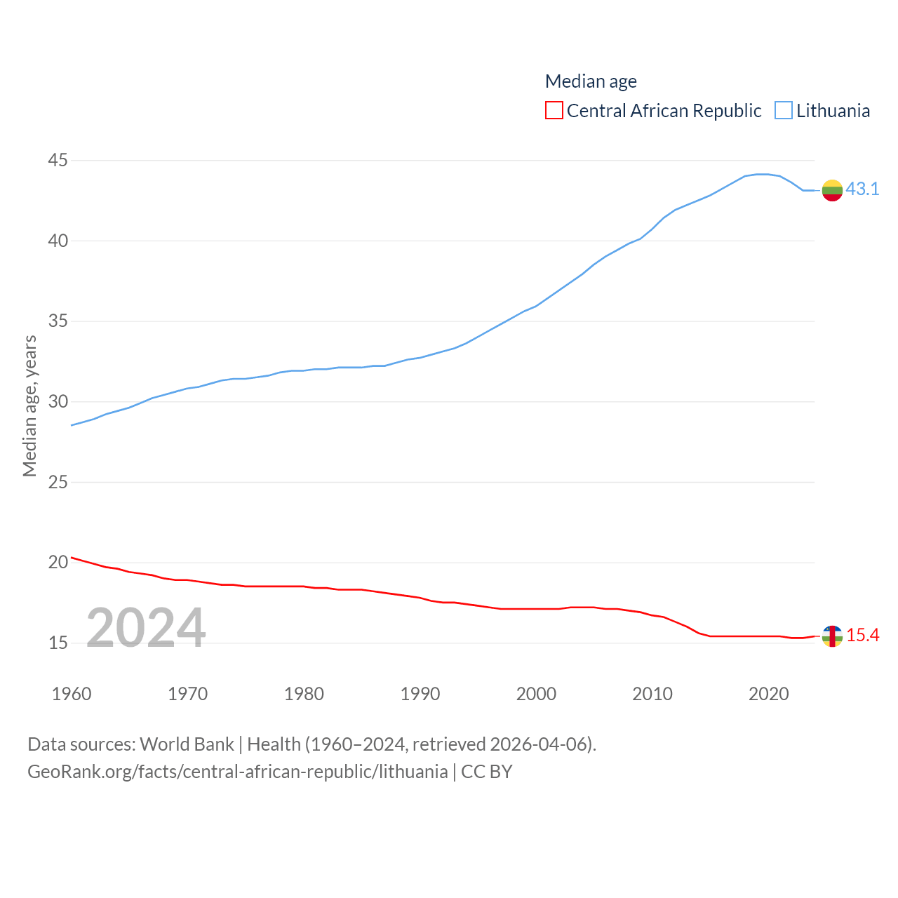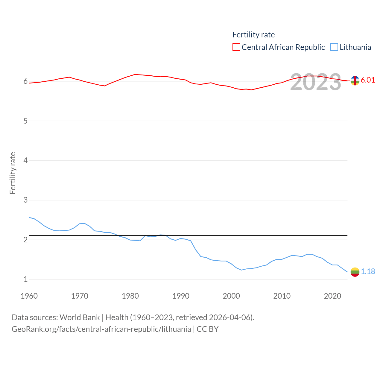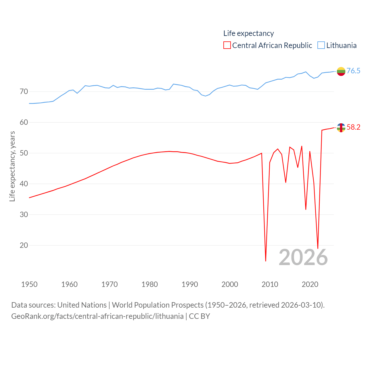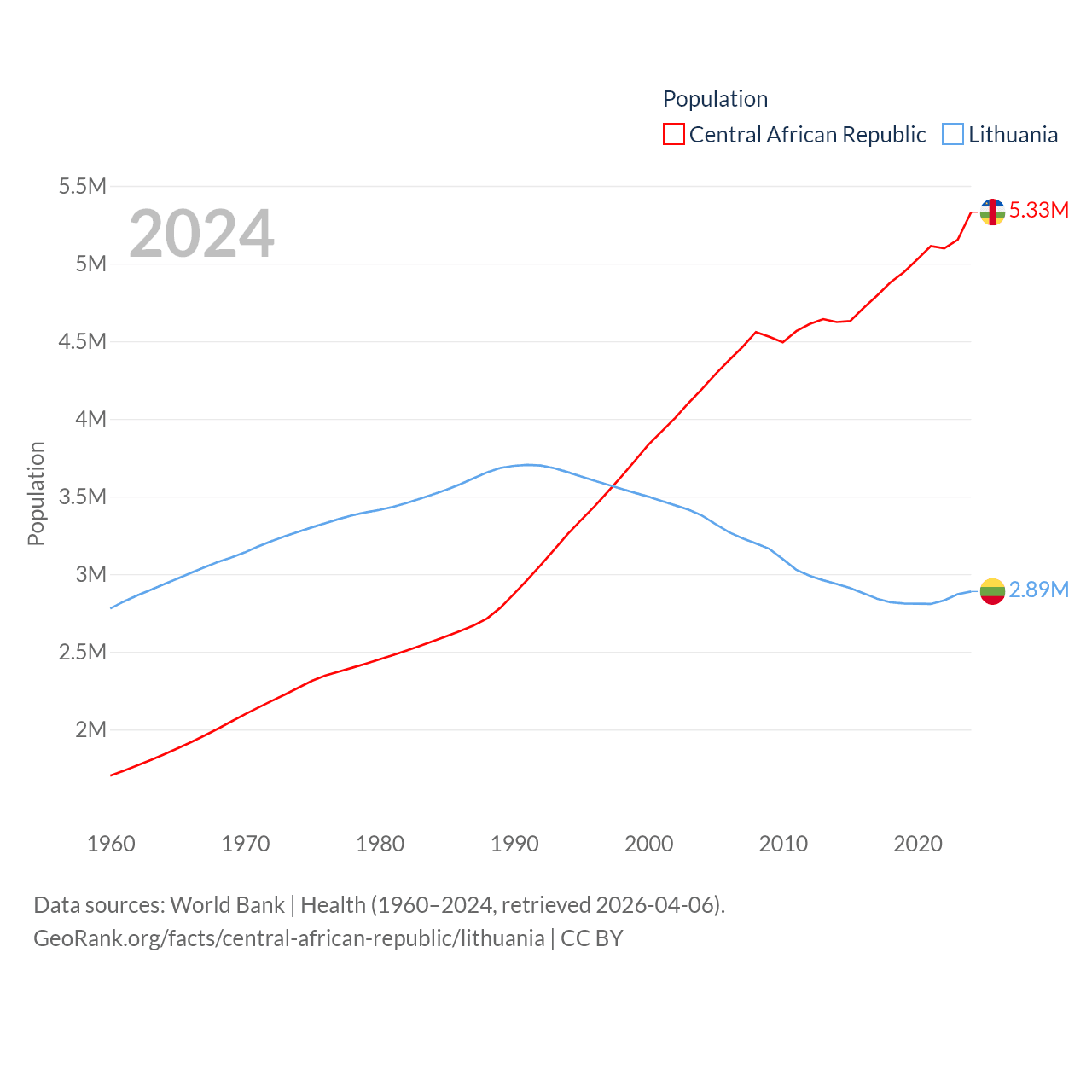 The Central African Republic has a population of 5.33M (ranked 121/197), compared with 2.89M in Lithuania (ranked 137/197). The Central African Republic's land area is 240,534 sq mi versus 24,170 sq mi for Lithuania (ranked 43rd vs. 120th).
