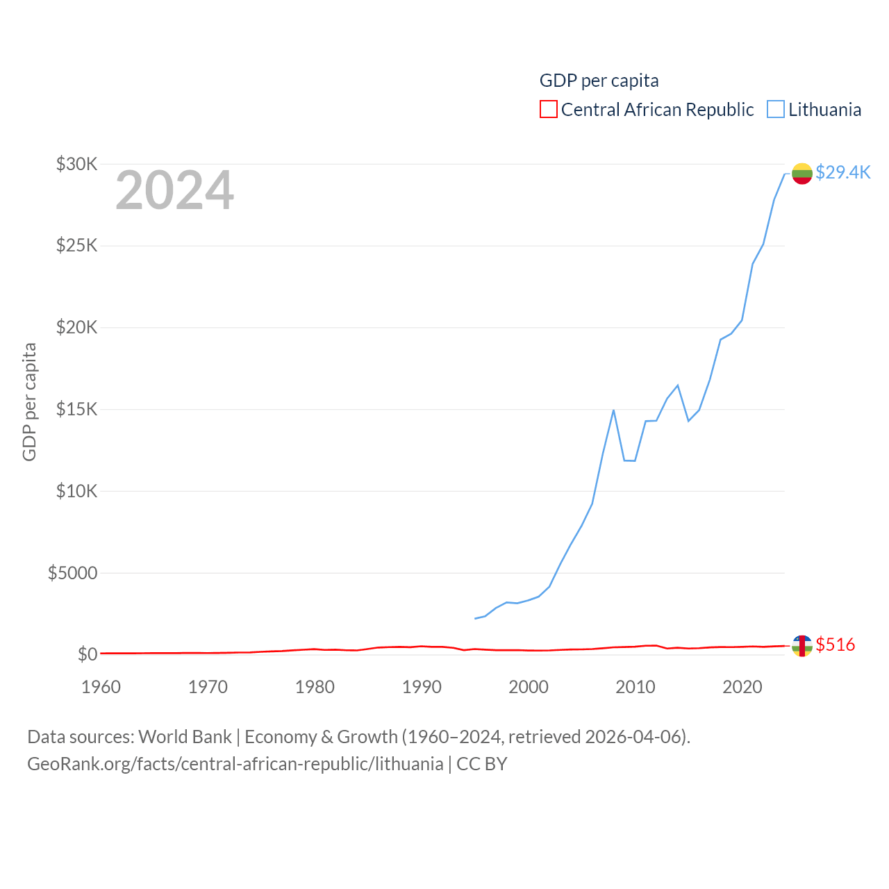By GDP, The Central African Republic ranks 171/197 ($2.75B) and Lithuania ranks 79/197 ($84.9B). By GDP per capita, The Central African Republic ranks 195/197 ($516), while Lithuania ranks 43/197 ($29,384).