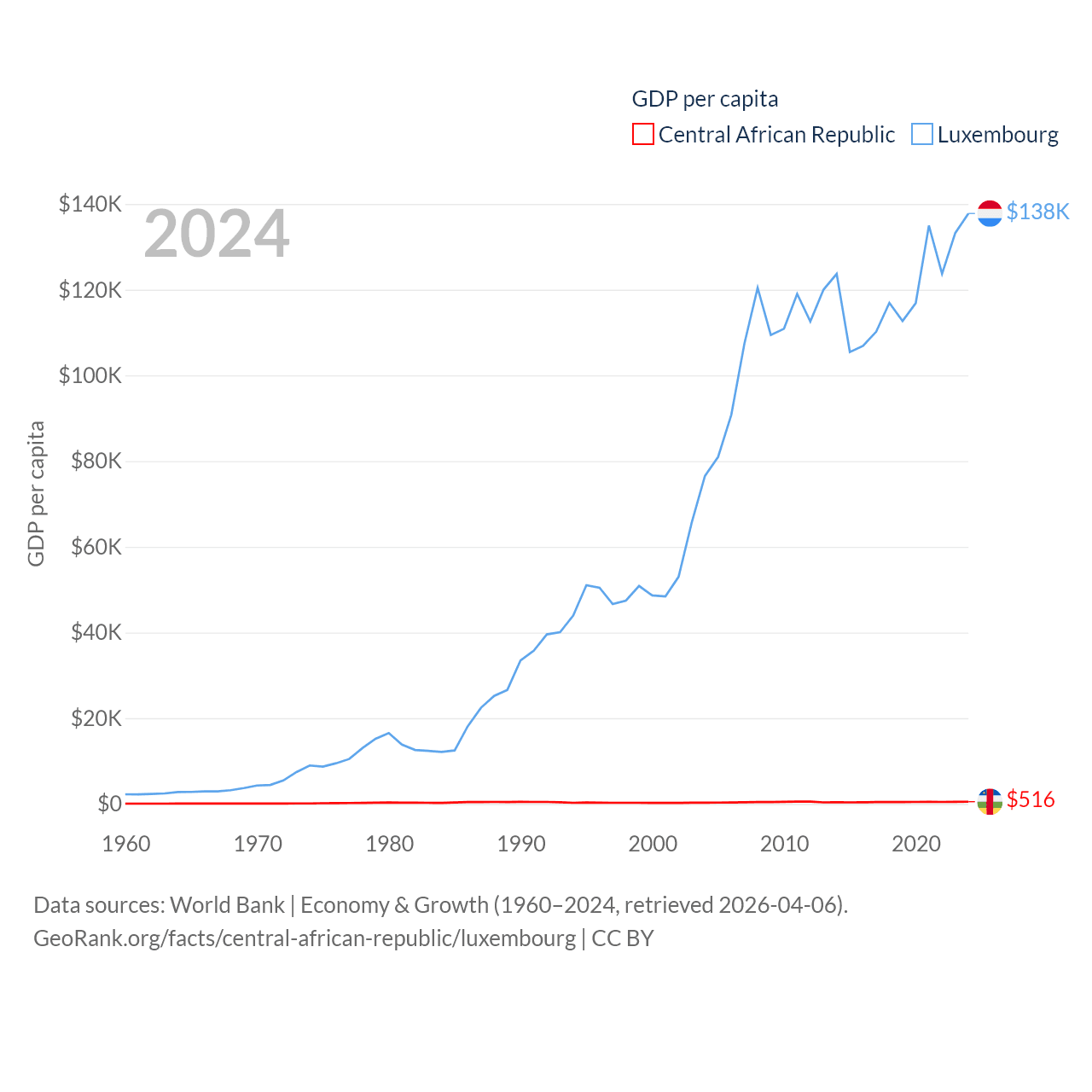 By GDP, The Central African Republic ranks 171/197 ($2.75B) and Luxembourg ranks 74/197 ($93.3B). By GDP per capita, The Central African Republic ranks 195/197 ($516), while Luxembourg ranks 3/197 ($137,782).