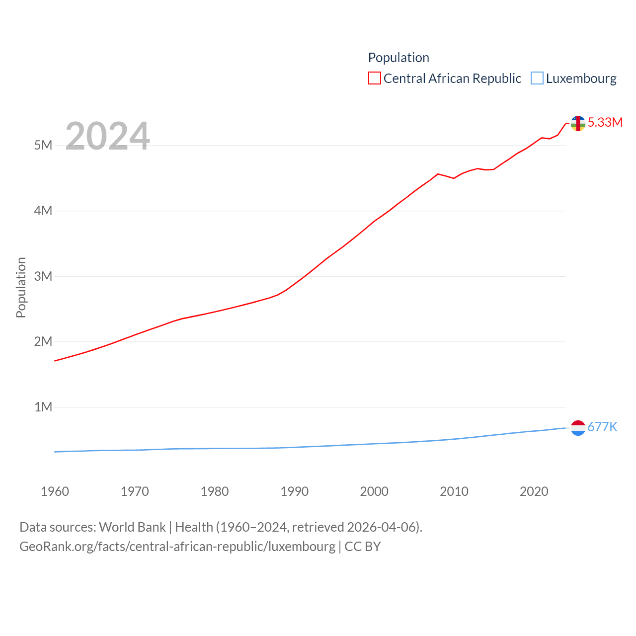 The Central African Republic has a population of 5.33M (ranked 121/197), compared with 677K in Luxembourg (ranked 164/197). The Central African Republic's land area is 240,534 sq mi versus 994 sq mi for Luxembourg (ranked 43rd vs. 169th).