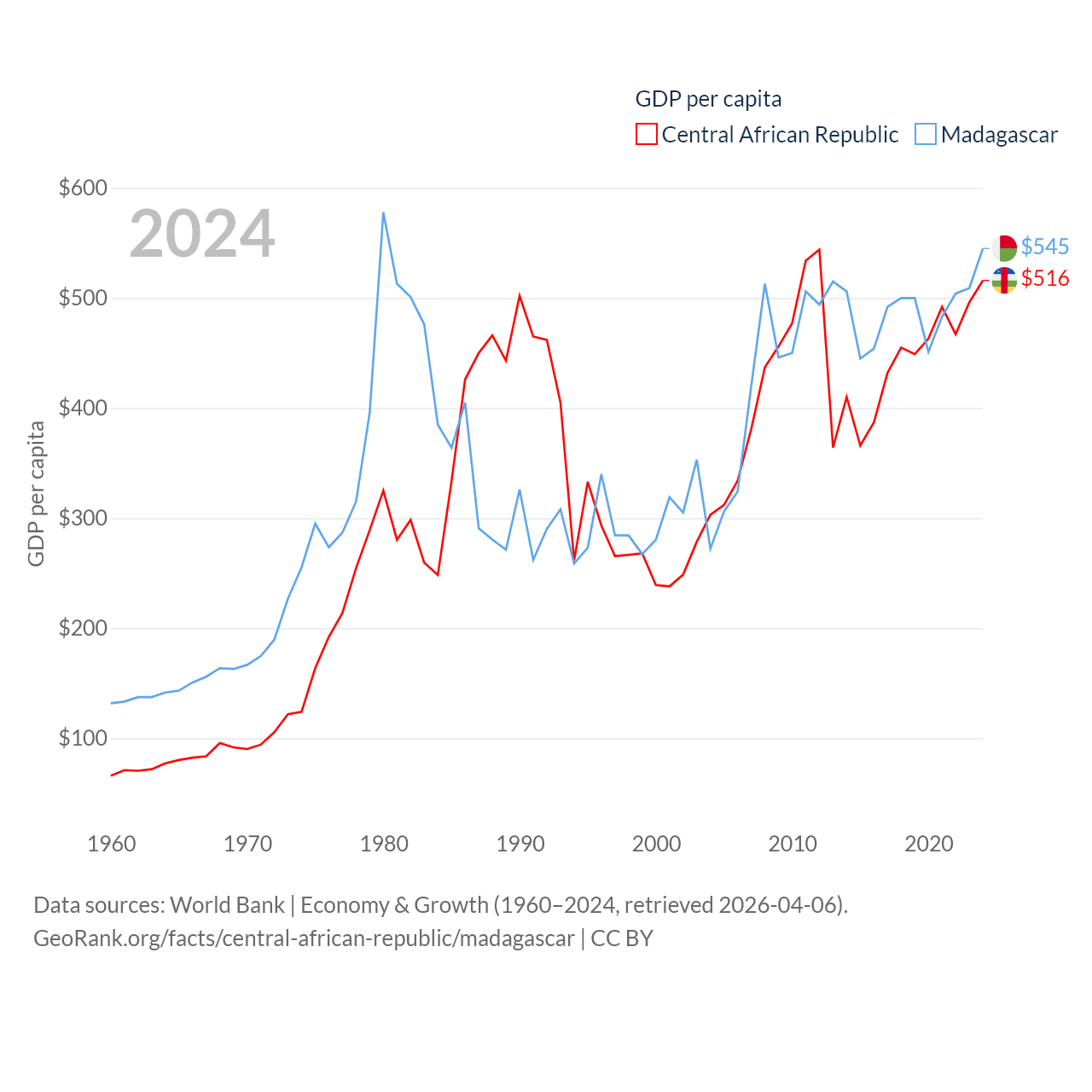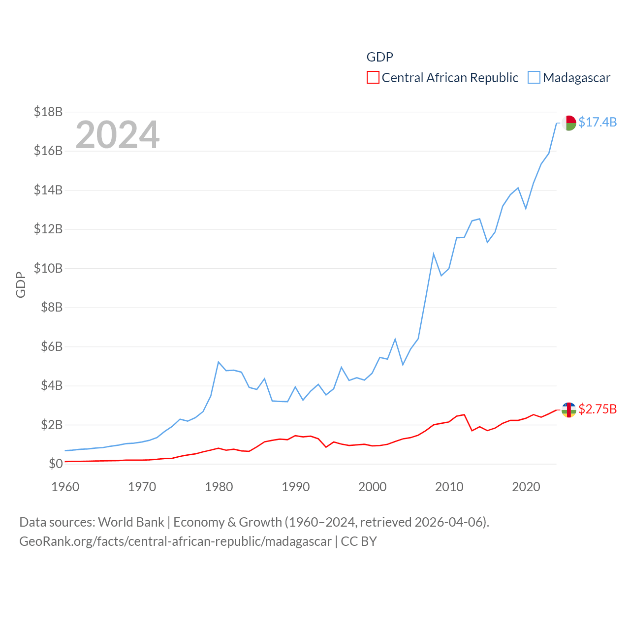 By GDP, The Central African Republic ranks 171/197 ($2.75B) and Madagascar ranks 136/197 ($17.4B). By GDP per capita, The Central African Republic ranks 195/197 ($516), while Madagascar ranks 193/197 ($545).