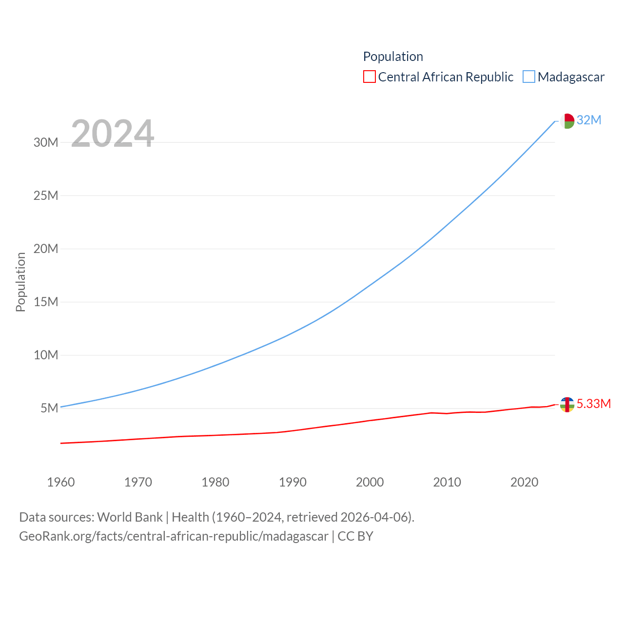 The Central African Republic has a population of 5.33M (ranked 121/197), compared with 32M in Madagascar (ranked 49/197). The Central African Republic's land area is 240,534 sq mi versus 224,634 sq mi for Madagascar (ranked 43rd vs. 44th).