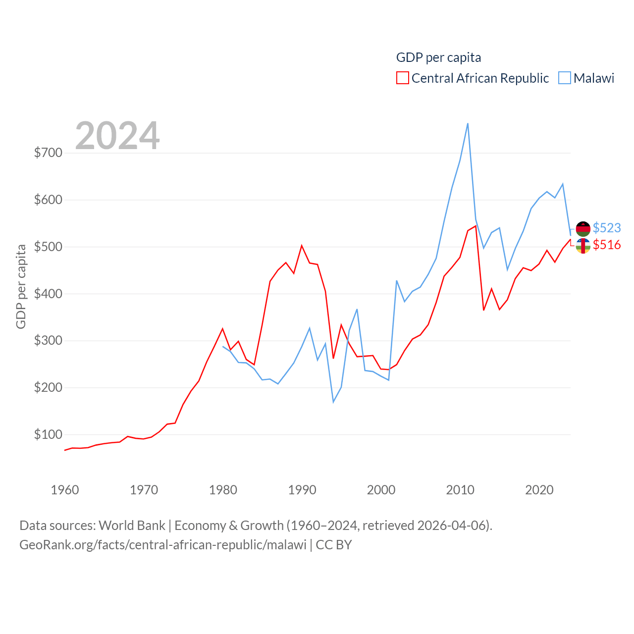 By GDP, The Central African Republic ranks 171/197 ($2.75B) and Malawi ranks 151/197 ($11.3B). By GDP per capita, The Central African Republic ranks 195/197 ($516), while Malawi ranks 194/197 ($523).