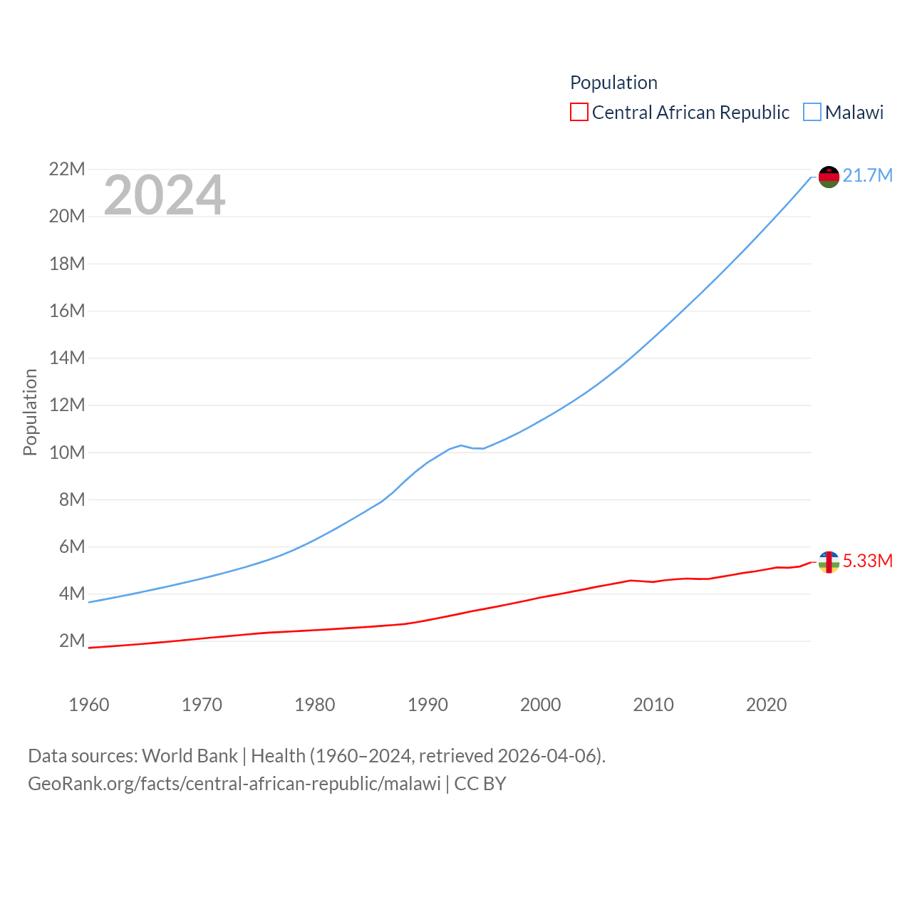 The Central African Republic has a population of 5.33M (ranked 121/197), compared with 21.7M in Malawi (ranked 62/197). The Central African Republic's land area is 240,534 sq mi versus 36,402 sq mi for Malawi (ranked 43rd vs. 107th).