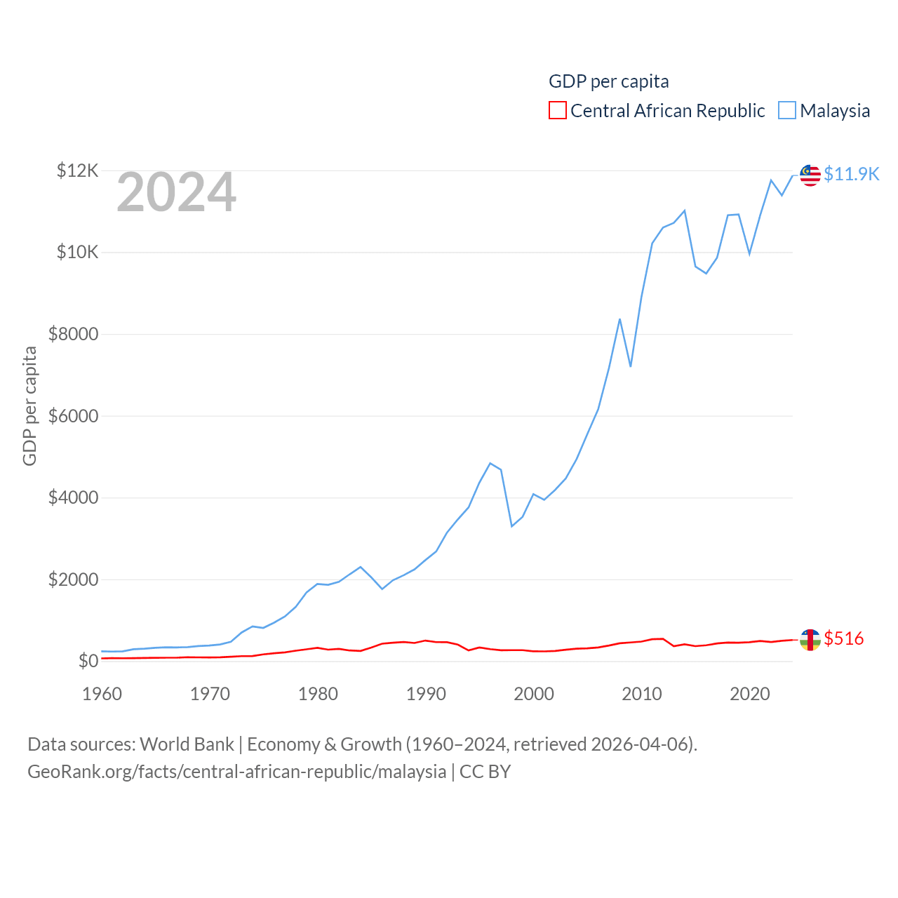By GDP, The Central African Republic ranks 171/197 ($2.75B) and Malaysia ranks 38/197 ($422B). By GDP per capita, The Central African Republic ranks 195/197 ($516), while Malaysia ranks 79/197 ($11,874).