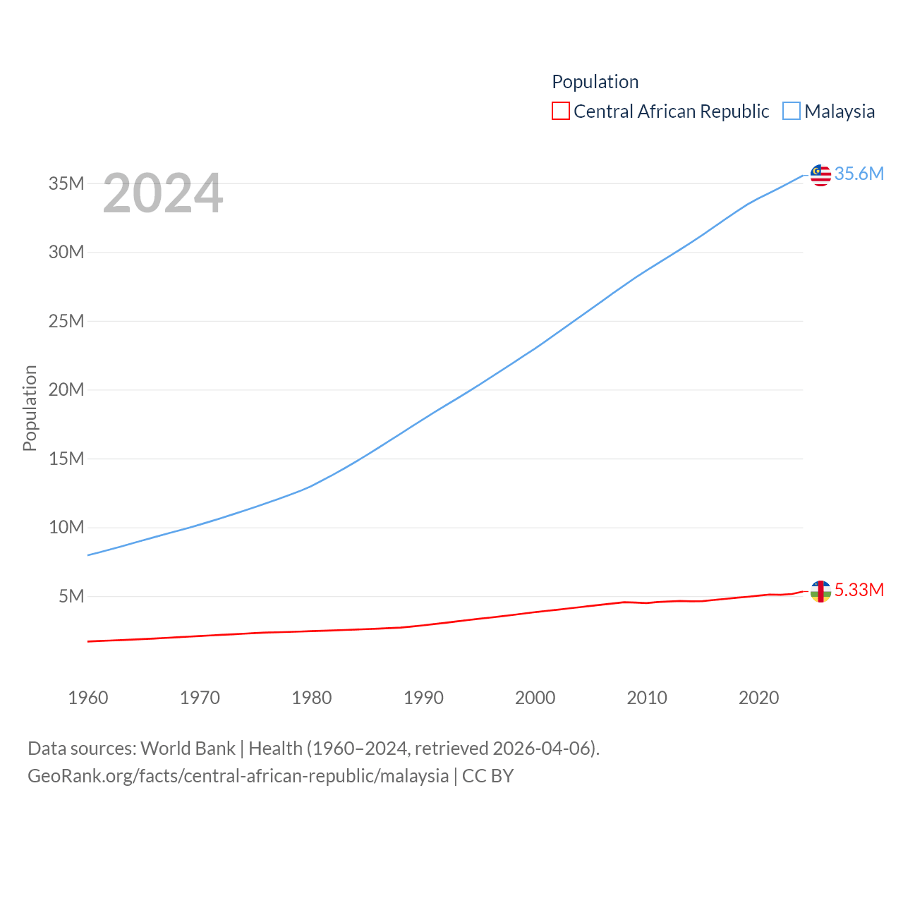 The Central African Republic has a population of 5.33M (ranked 121/197), compared with 35.6M in Malaysia (ranked 44/197). The Central African Republic's land area is 240,534 sq mi versus 126,854 sq mi for Malaysia (ranked 43rd vs. 65th).