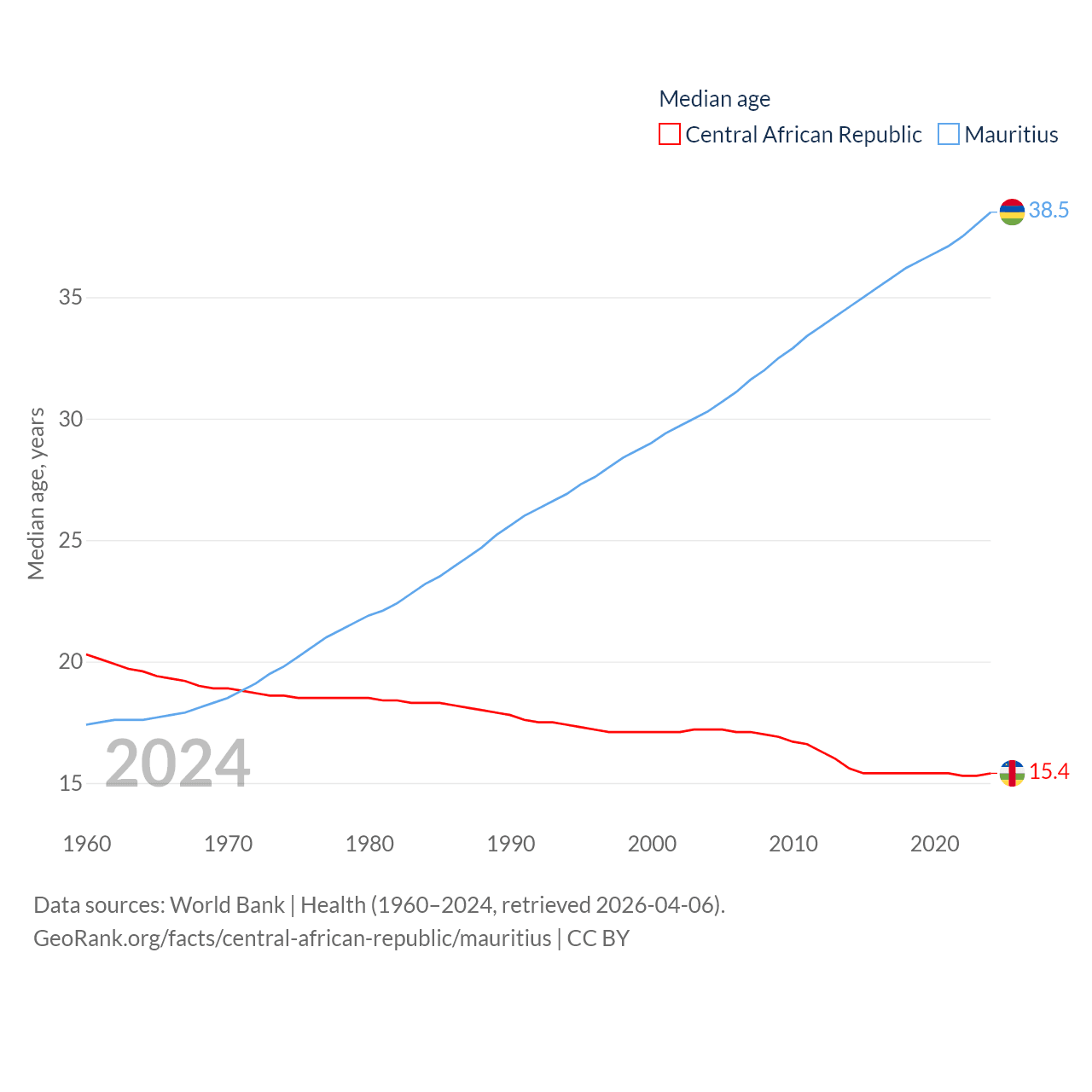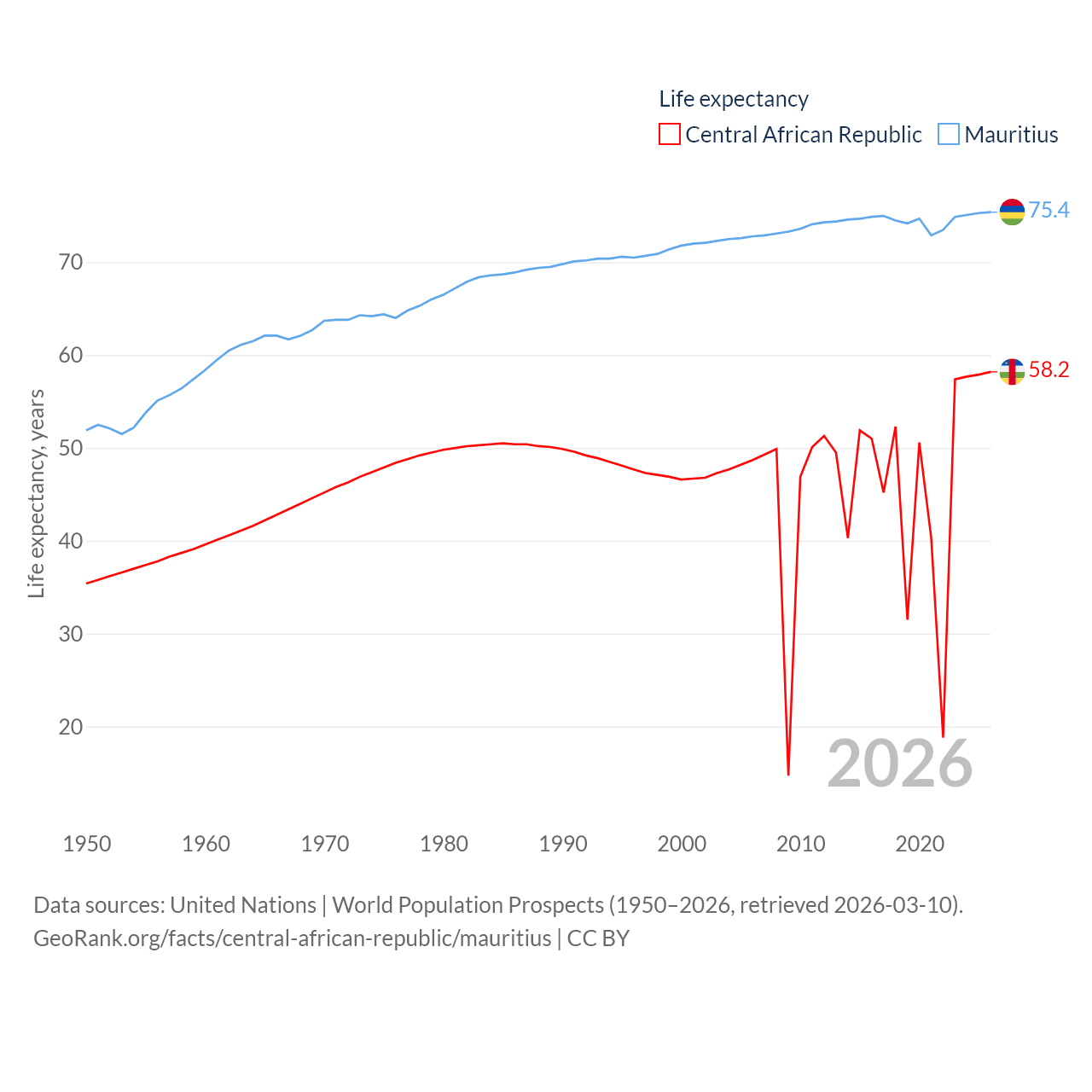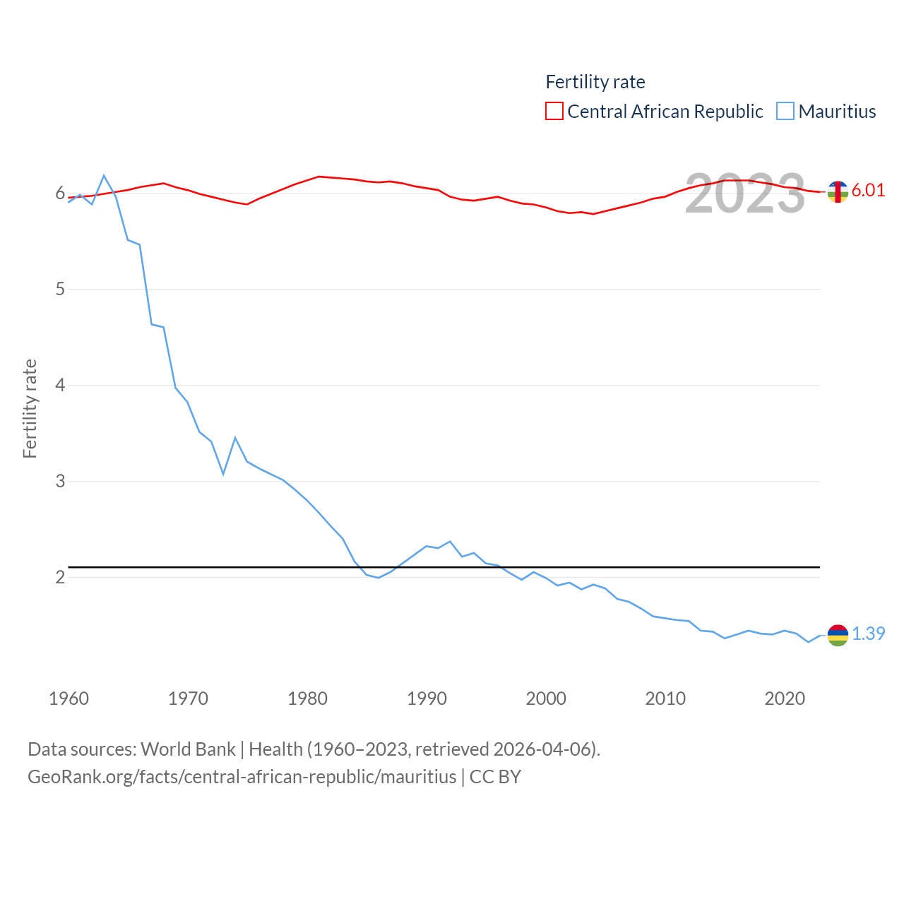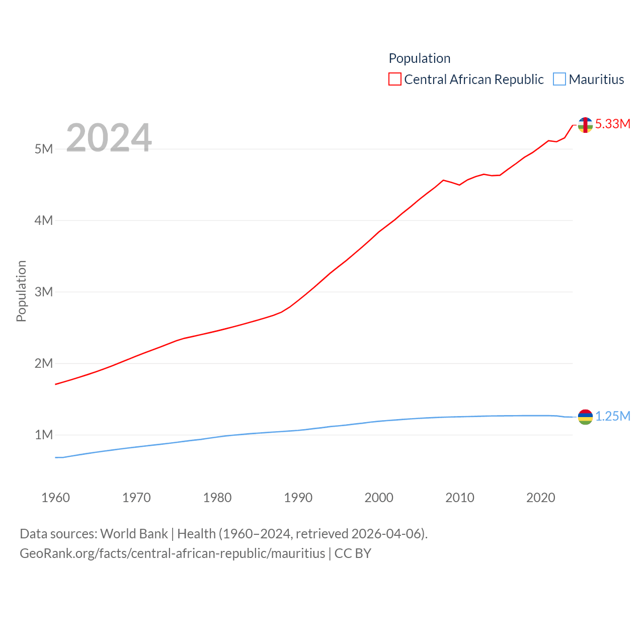 The Central African Republic has a population of 5.33M (ranked 121/197), compared with 1.25M in Mauritius (ranked 156/197). The Central African Republic's land area is 240,534 sq mi versus 771 sq mi for Mauritius (ranked 43rd vs. 170th).