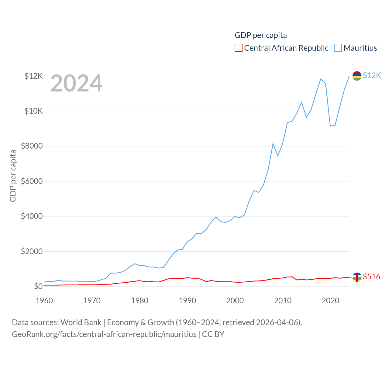 By GDP, The Central African Republic ranks 171/197 ($2.75B) and Mauritius ranks 143/197 ($14.9B). By GDP per capita, The Central African Republic ranks 195/197 ($516), while Mauritius ranks 78/197 ($11,991).