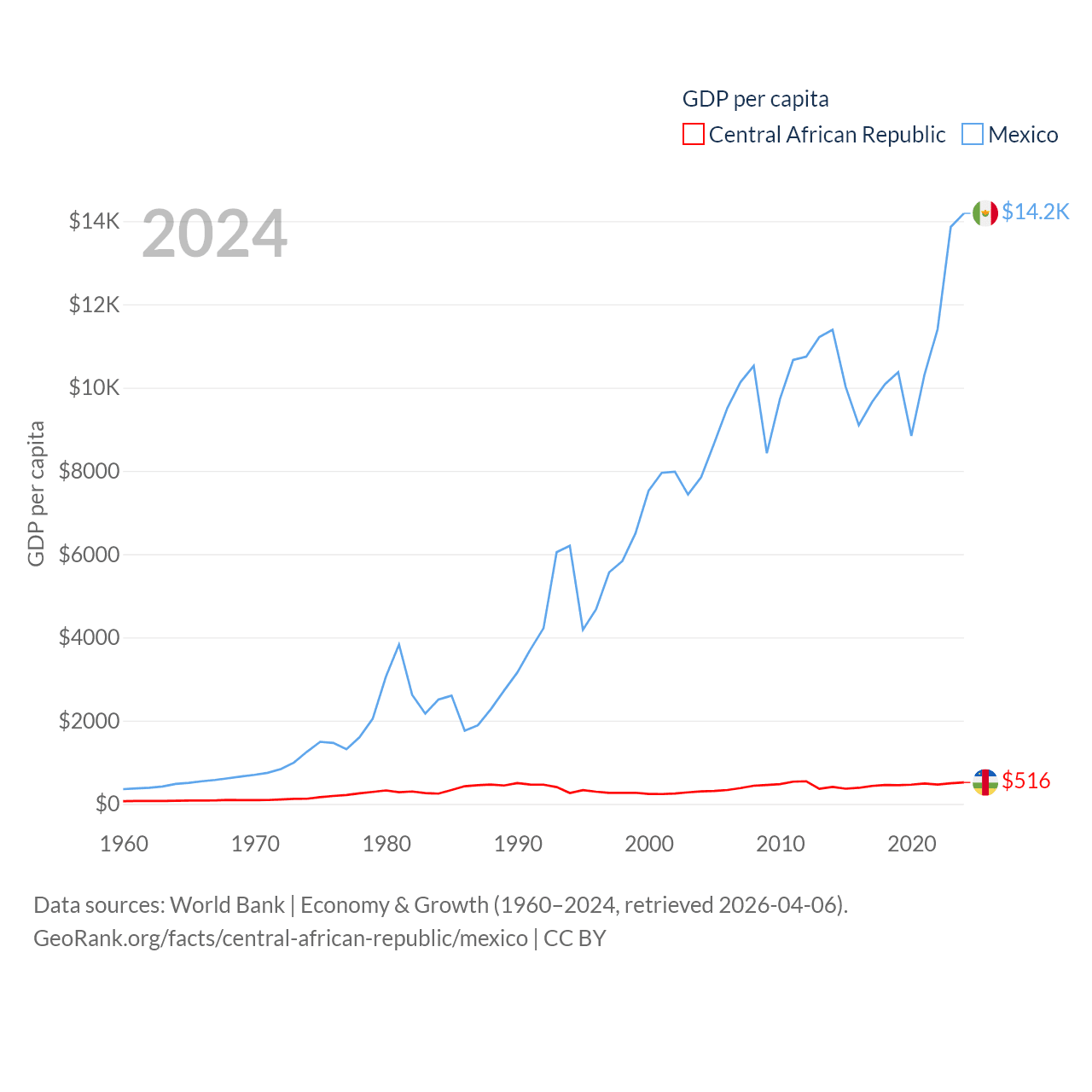 By GDP, The Central African Republic ranks 171/197 ($2.75B) and Mexico ranks 13/197 ($1.86T). By GDP per capita, The Central African Republic ranks 195/197 ($516), while Mexico ranks 69/197 ($14,186).