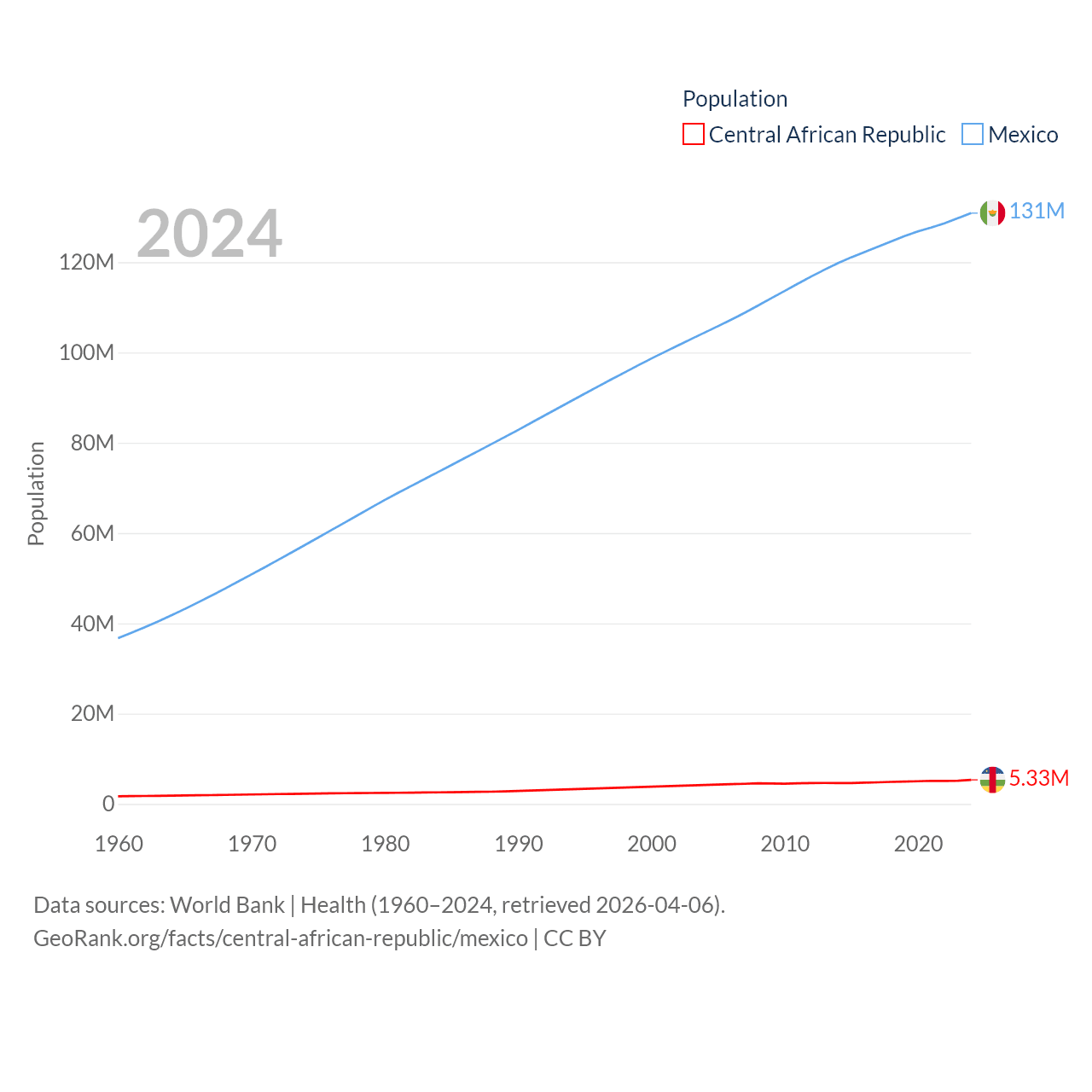 The Central African Republic has a population of 5.33M (ranked 121/197), compared with 131M in Mexico (ranked 11/197). The Central African Republic's land area is 240,534 sq mi versus 750,563 sq mi for Mexico (ranked 43rd vs. 13th).