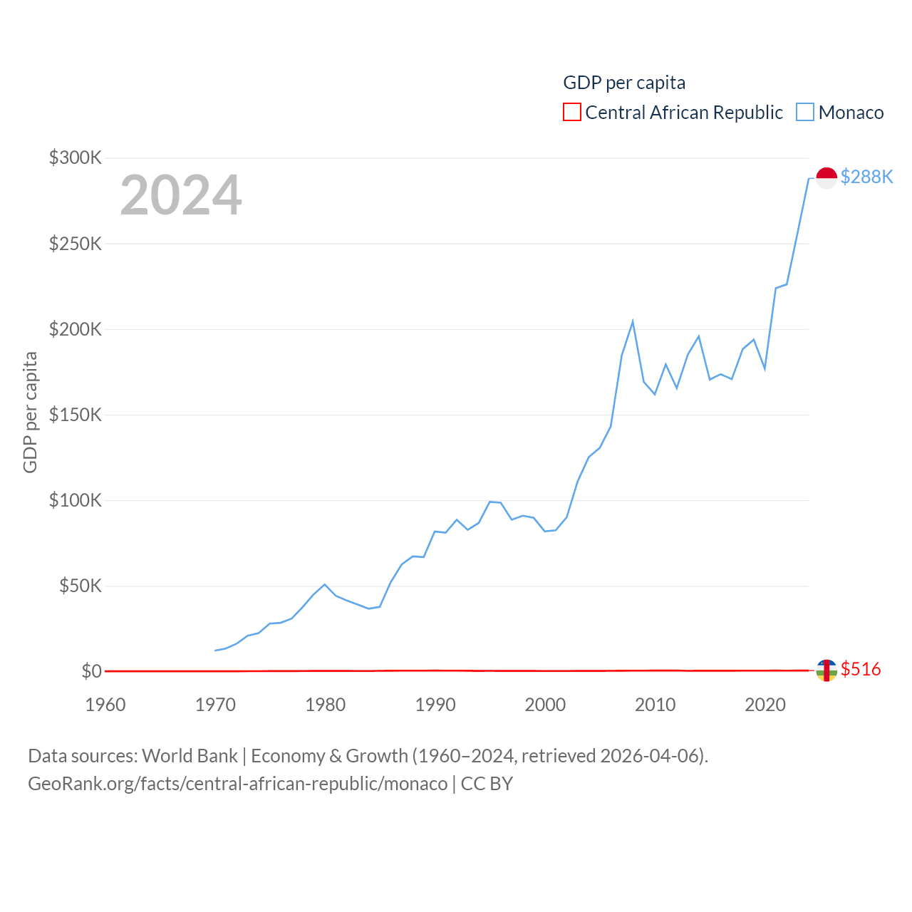 By GDP, The Central African Republic ranks 171/197 ($2.75B) and Monaco ranks 152/197 ($11.1B). By GDP per capita, The Central African Republic ranks 195/197 ($516), while Monaco ranks 1/197 ($288,001).