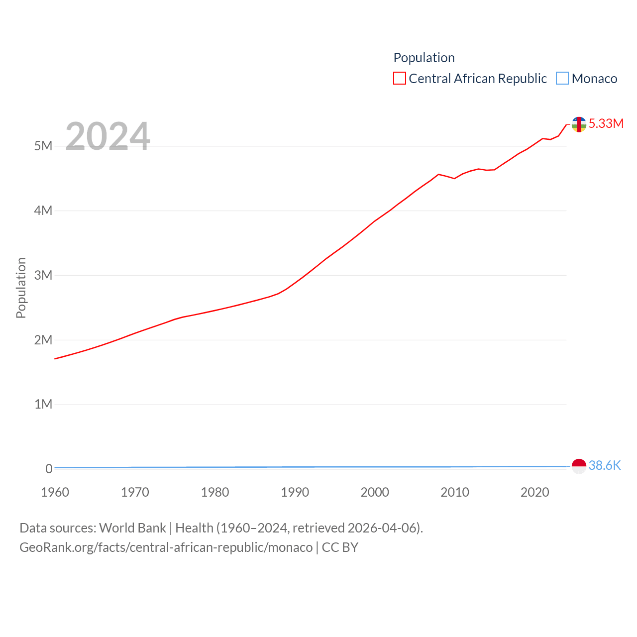 The Central African Republic has a population of 5.33M (ranked 121/197), compared with 38.6K in Monaco (ranked 191/197). The Central African Republic's land area is 240,534 sq mi versus 0.8 sq mi for Monaco (ranked 43rd vs. 196th).