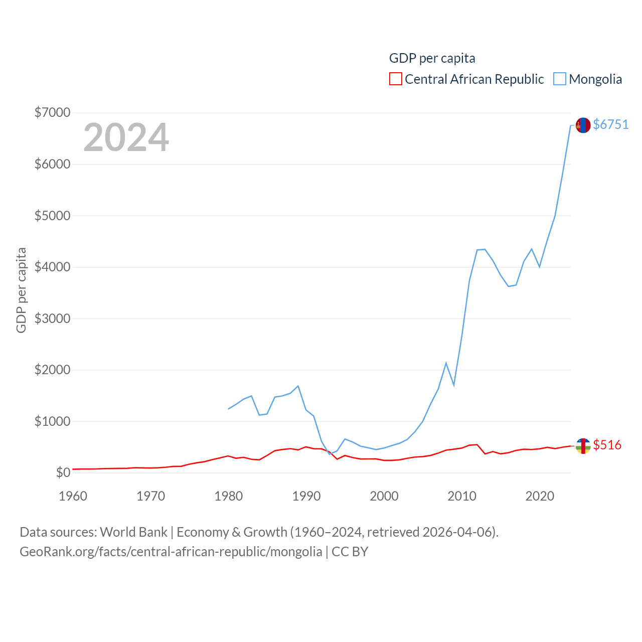 By GDP, The Central African Republic ranks 171/197 ($2.75B) and Mongolia ranks 121/197 ($23.8B). By GDP per capita, The Central African Republic ranks 195/197 ($516), while Mongolia ranks 105/197 ($6,751).
