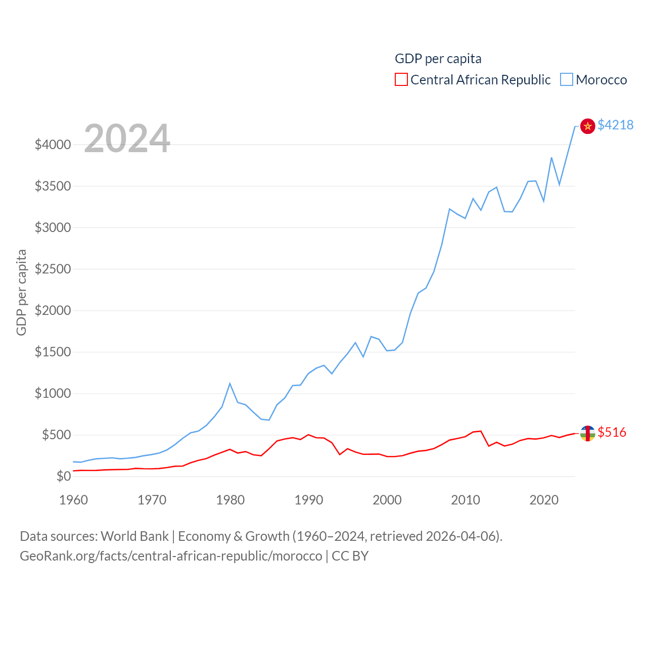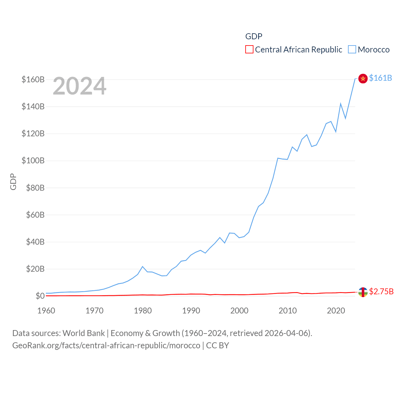 By GDP, The Central African Republic ranks 171/197 ($2.75B) and Morocco ranks 58/197 ($161B). By GDP per capita, The Central African Republic ranks 195/197 ($516), while Morocco ranks 127/197 ($4,218).