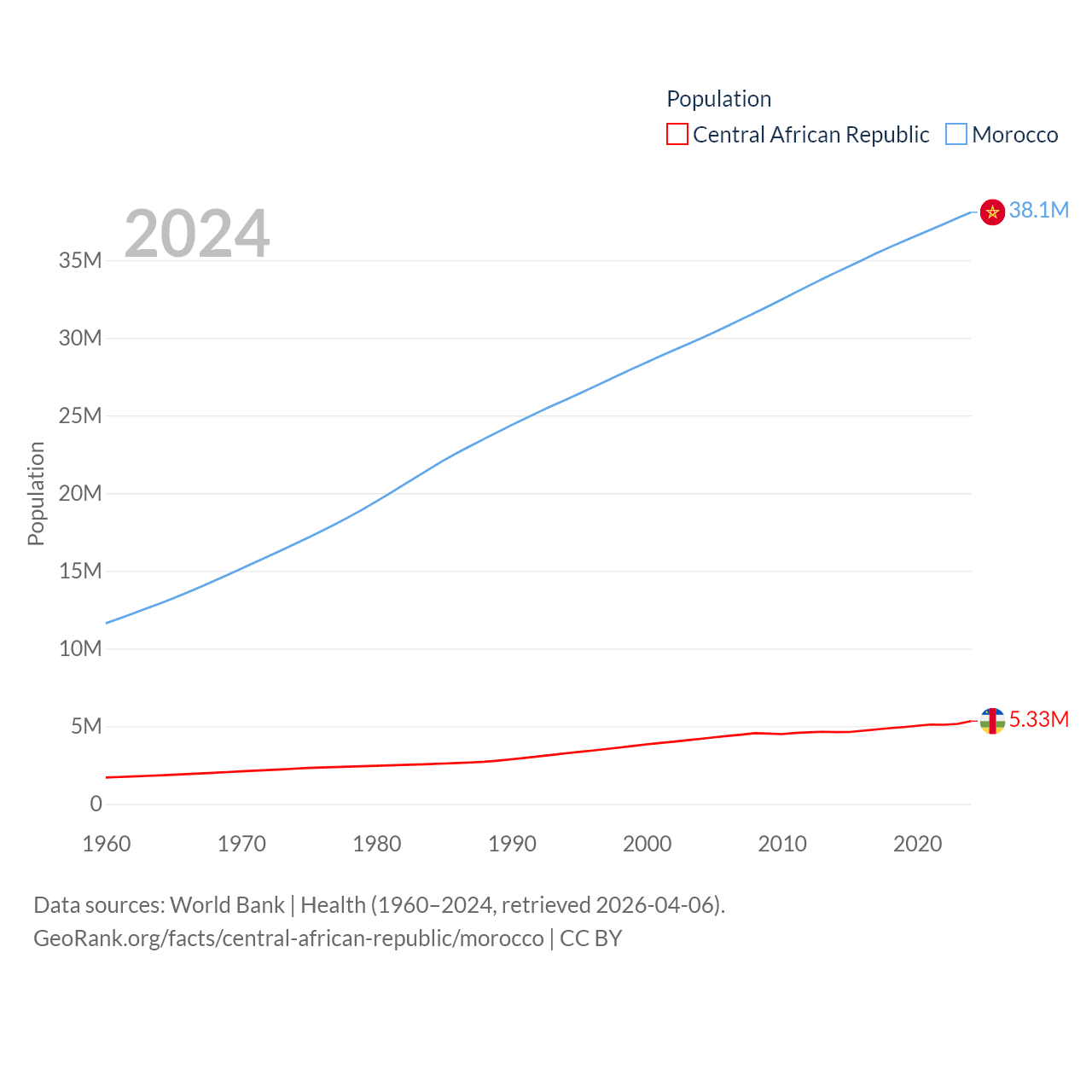 The Central African Republic has a population of 5.33M (ranked 121/197), compared with 38.1M in Morocco (ranked 39/197). The Central African Republic's land area is 240,534 sq mi versus 172,317 sq mi for Morocco (ranked 43rd vs. 55th).