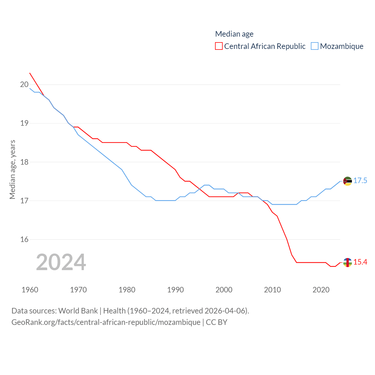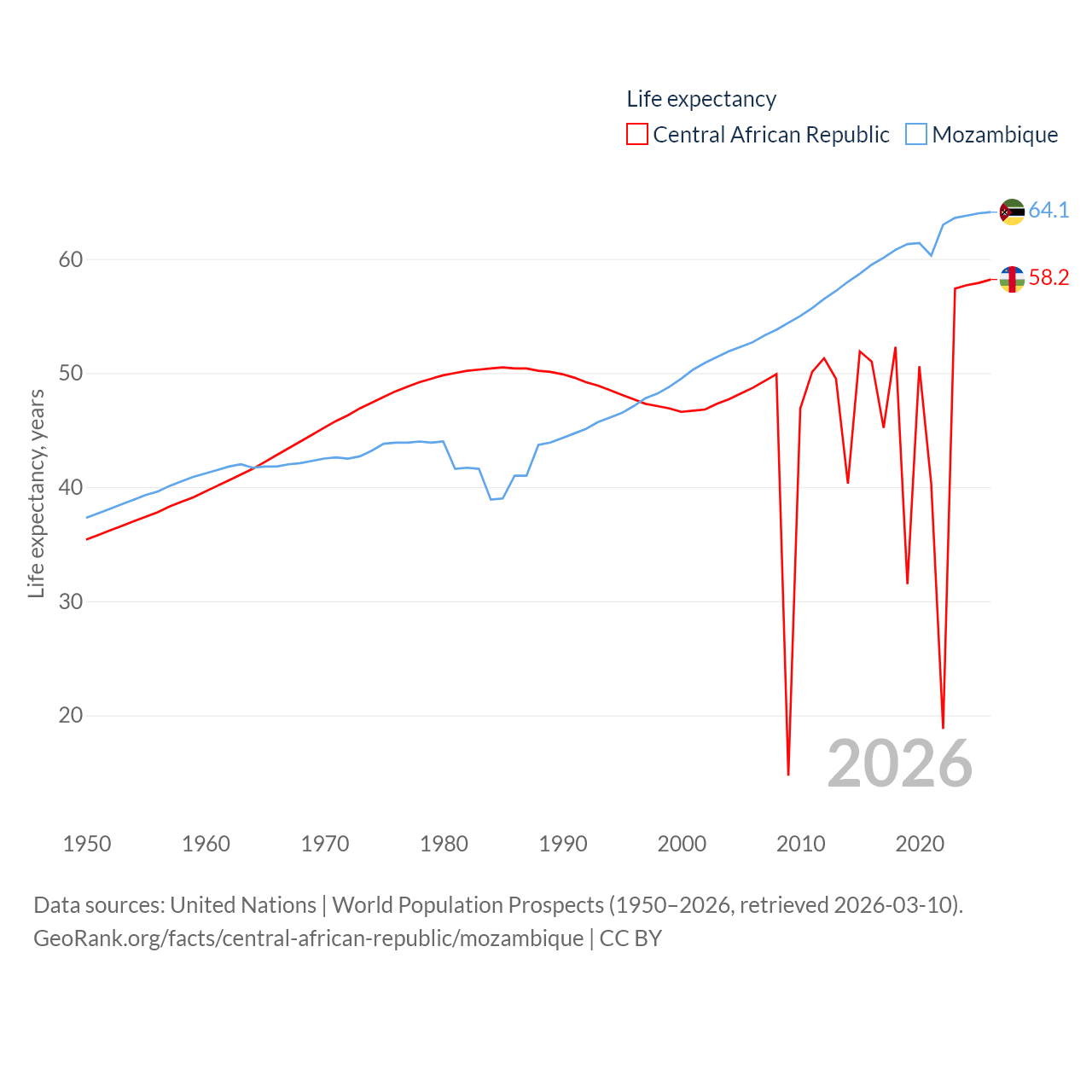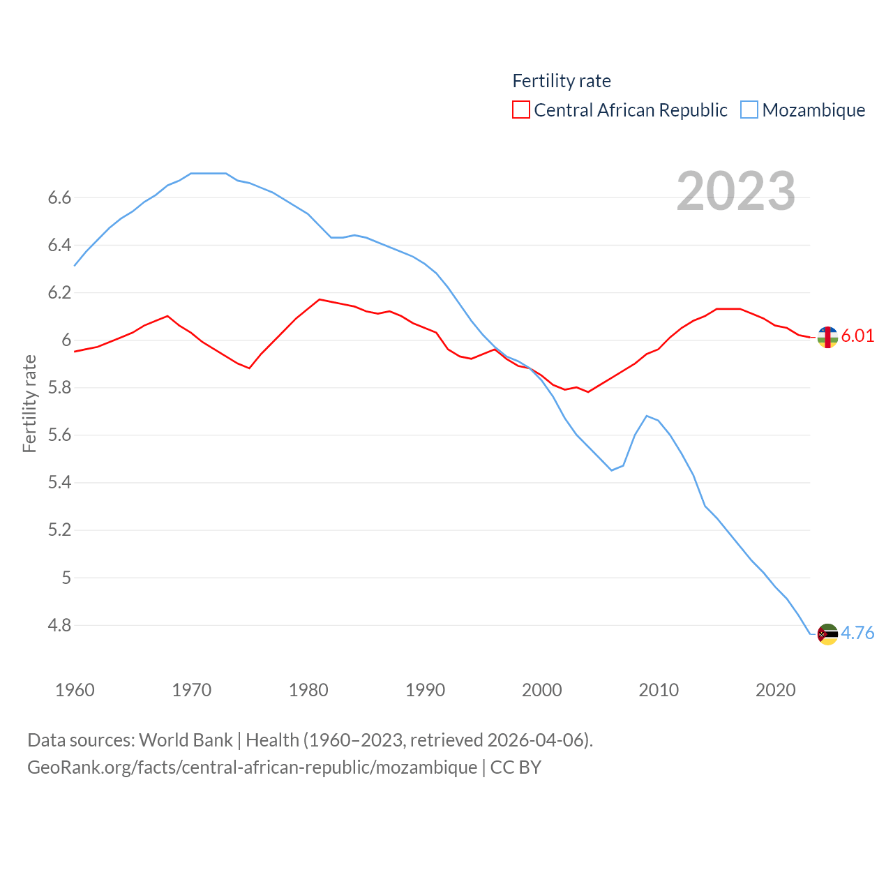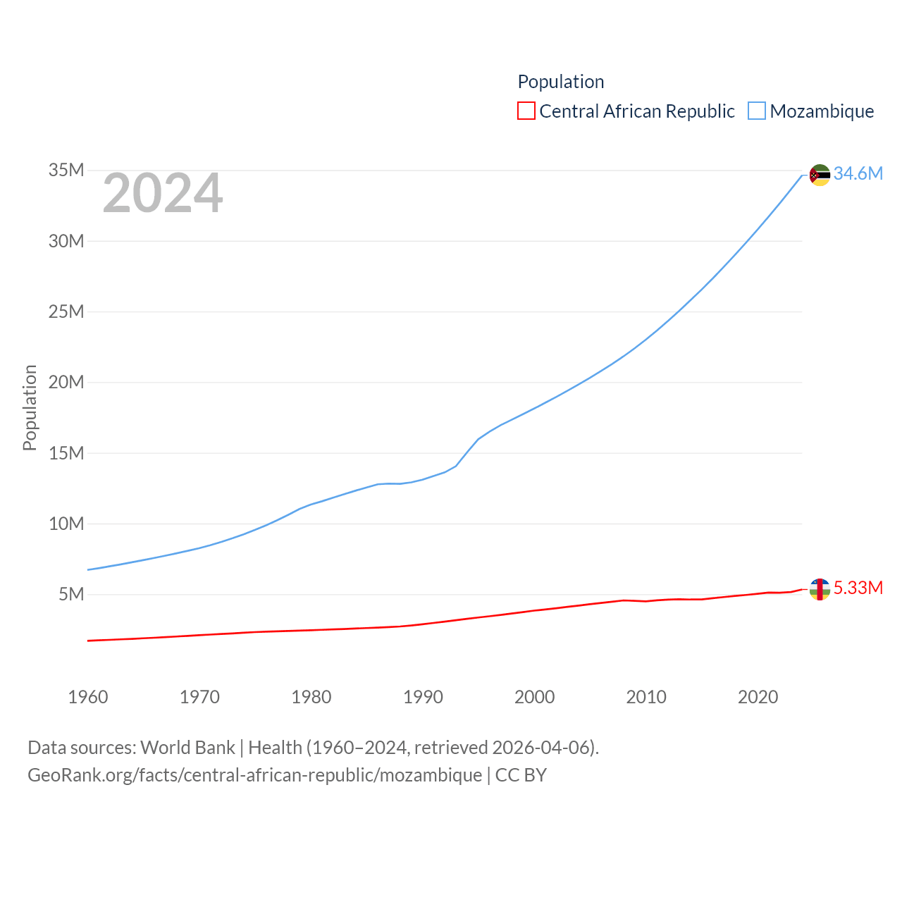 The Central African Republic has a population of 5.33M (ranked 121/197), compared with 34.6M in Mozambique (ranked 46/197). The Central African Republic's land area is 240,534 sq mi versus 303,623 sq mi for Mozambique (ranked 43rd vs. 34th).