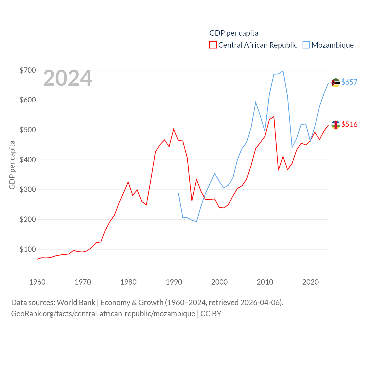 By GDP, The Central African Republic ranks 171/197 ($2.75B) and Mozambique ranks 123/197 ($22.7B). By GDP per capita, The Central African Republic ranks 195/197 ($516), while Mozambique ranks 189/197 ($657).