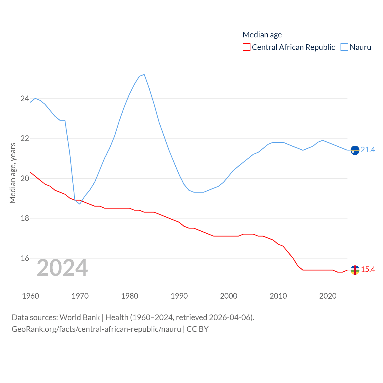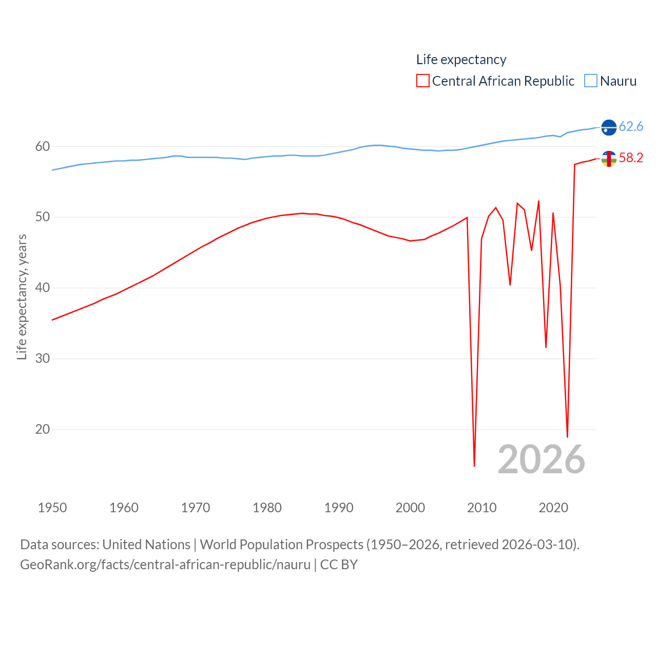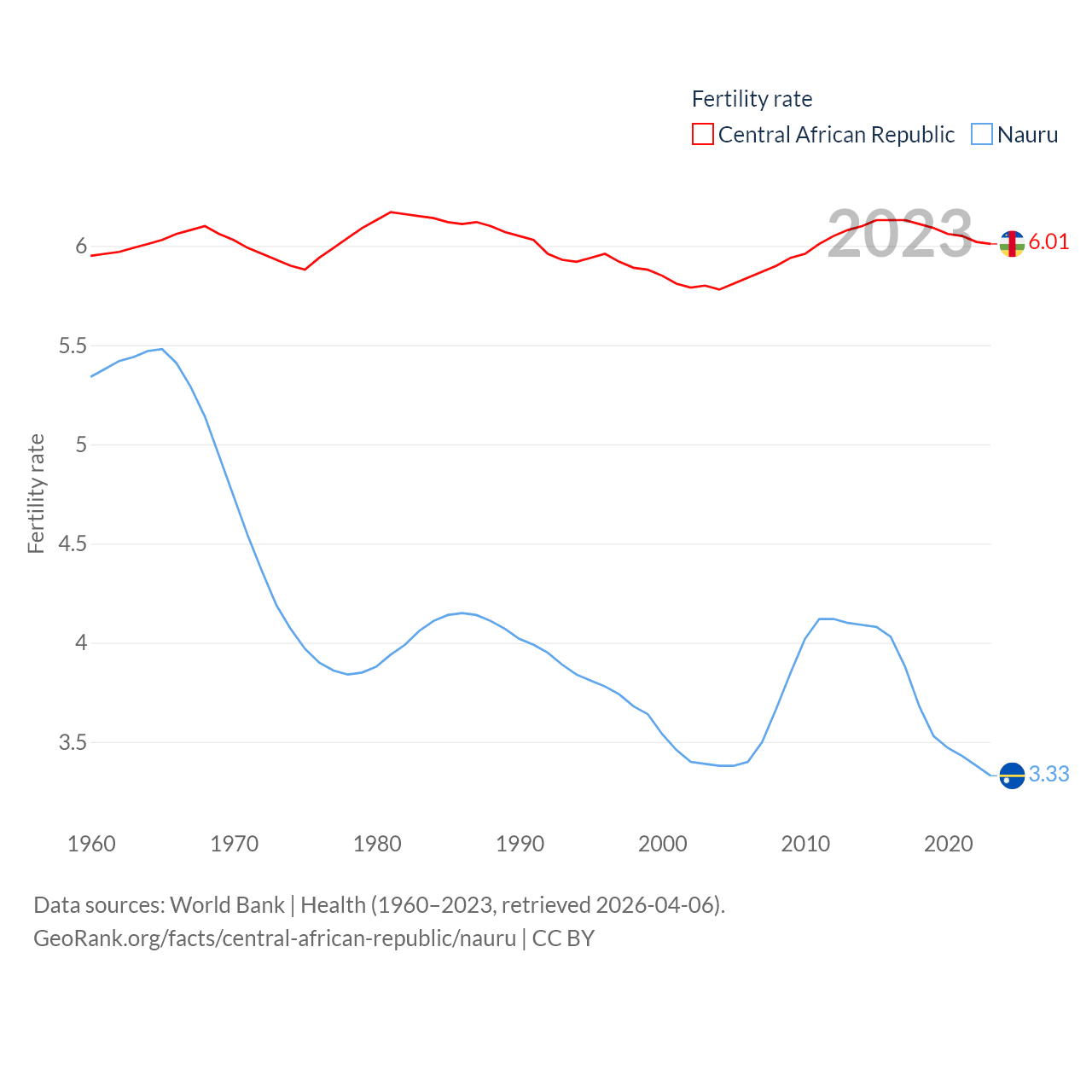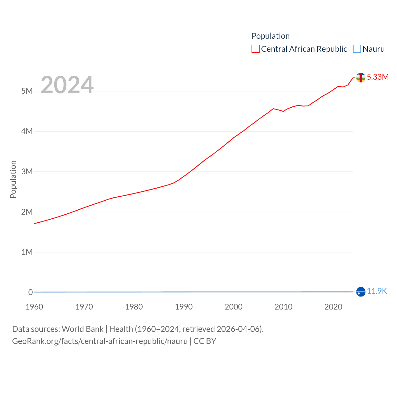 The Central African Republic has a population of 5.33M (ranked 121/197), compared with 11.9K in Nauru (ranked 195/197). The Central African Republic's land area is 240,534 sq mi versus 7.72 sq mi for Nauru (ranked 43rd vs. 195th).