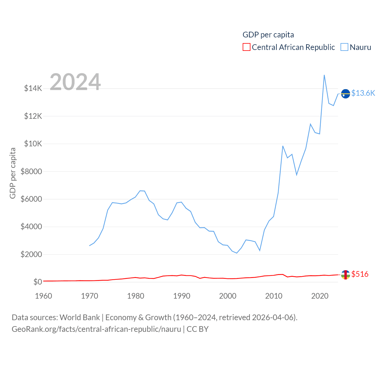 By GDP, The Central African Republic ranks 171/197 ($2.75B) and Nauru ranks 195/197 ($163M). By GDP per capita, The Central African Republic ranks 195/197 ($516), while Nauru ranks 74/197 ($13,609).