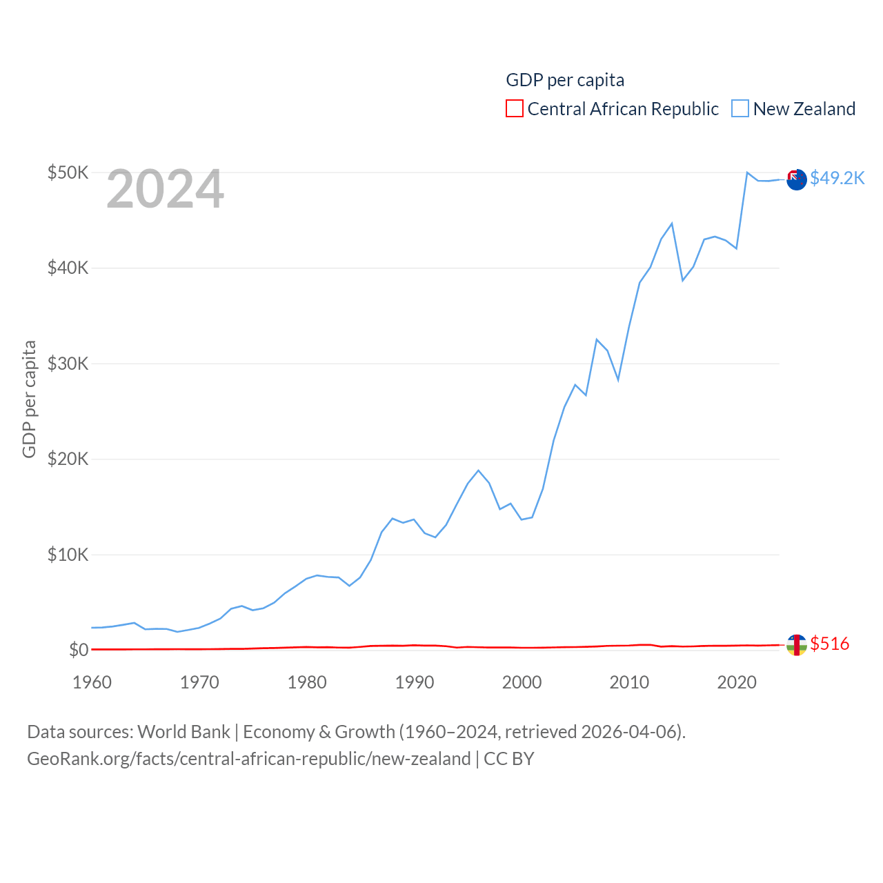 By GDP, The Central African Republic ranks 171/197 ($2.75B) and New Zealand ranks 52/197 ($260B). By GDP per capita, The Central African Republic ranks 195/197 ($516), while New Zealand ranks 26/197 ($49,205).