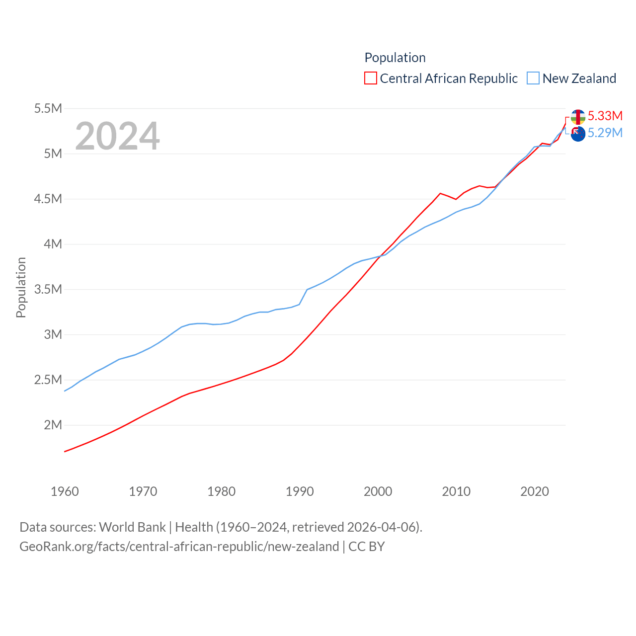 The Central African Republic has a population of 5.33M (ranked 121/197), compared with 5.29M in New Zealand (ranked 123/197). The Central African Republic's land area is 240,534 sq mi versus 101,665 sq mi for New Zealand (ranked 43rd vs. 74th).