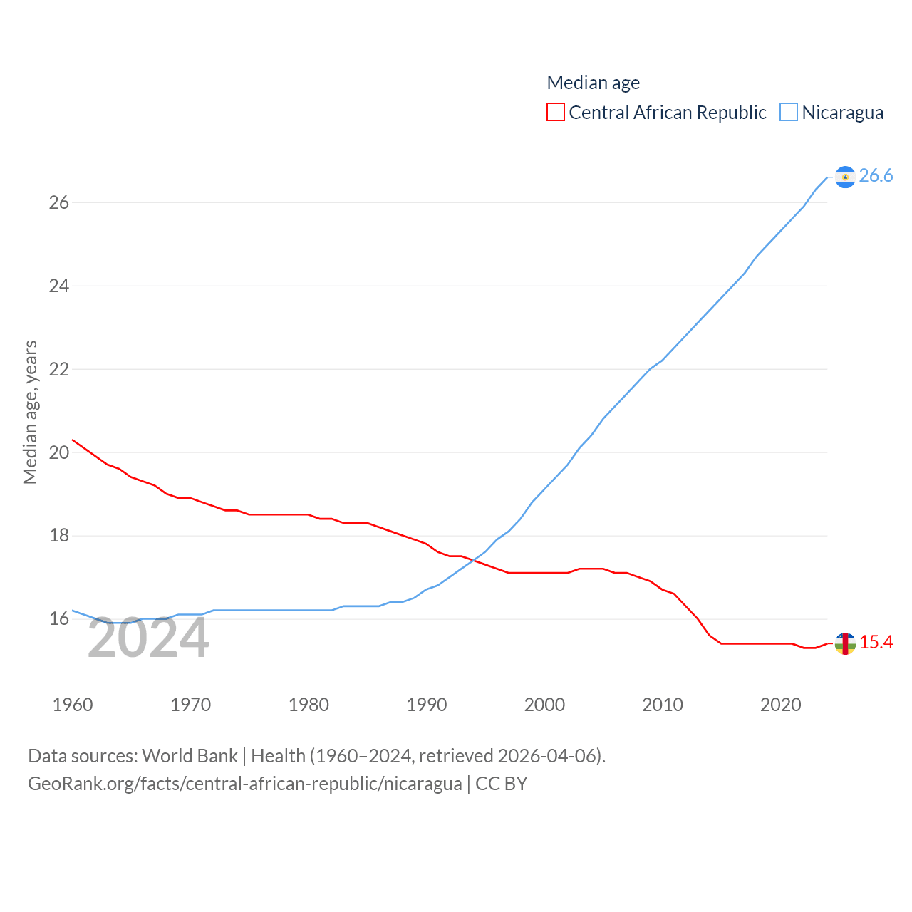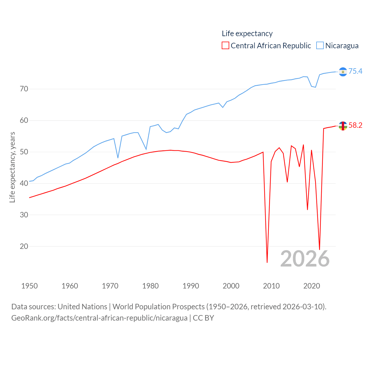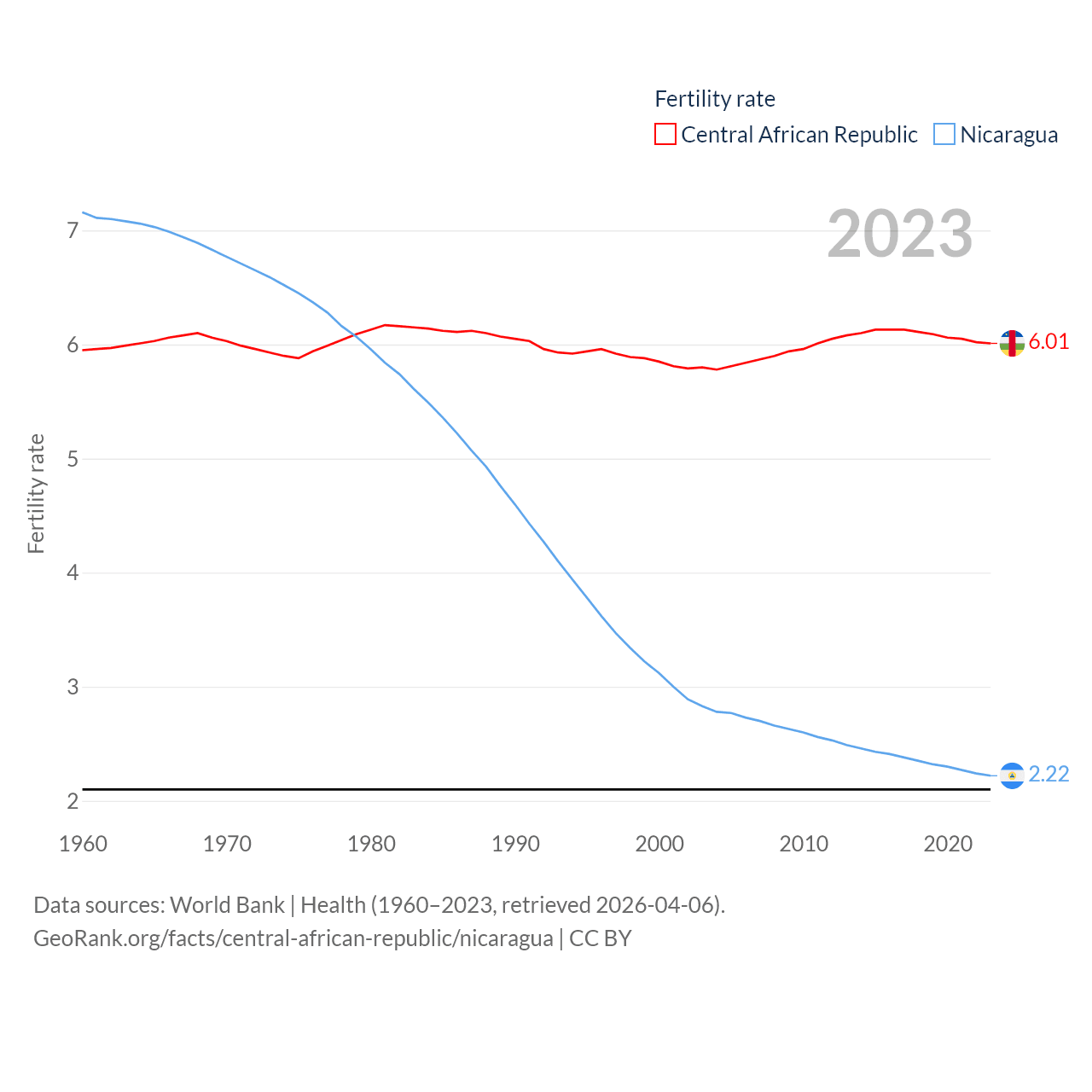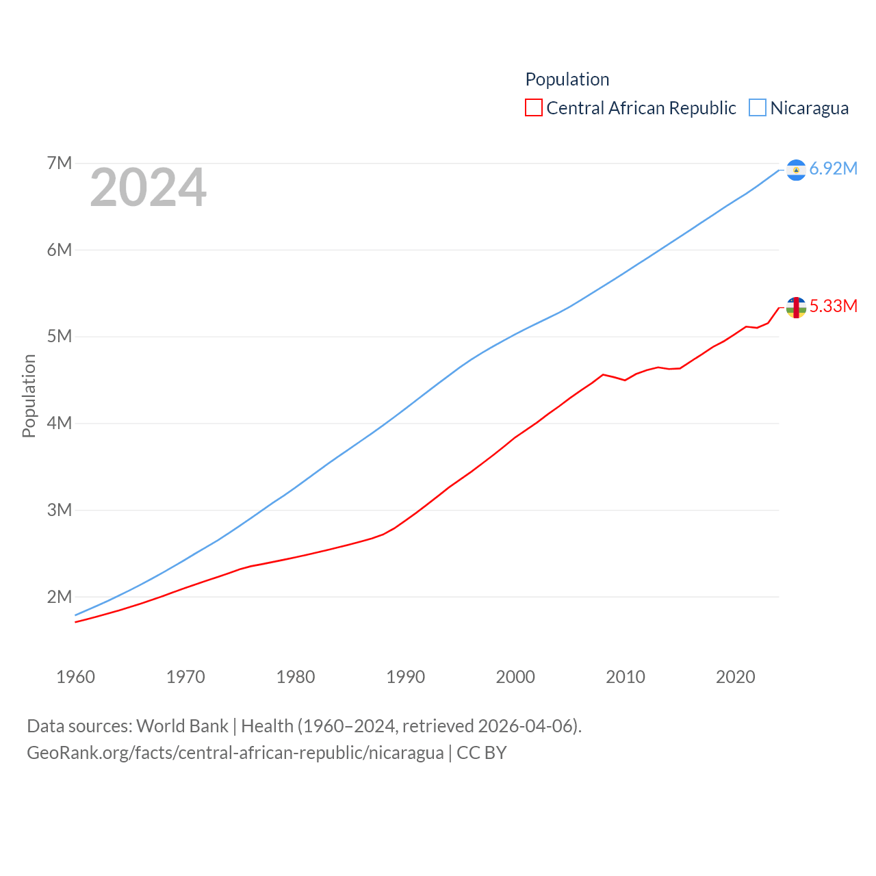 The Central African Republic has a population of 5.33M (ranked 121/197), compared with 6.92M in Nicaragua (ranked 108/197). The Central African Republic's land area is 240,534 sq mi versus 46,464 sq mi for Nicaragua (ranked 43rd vs. 98th).