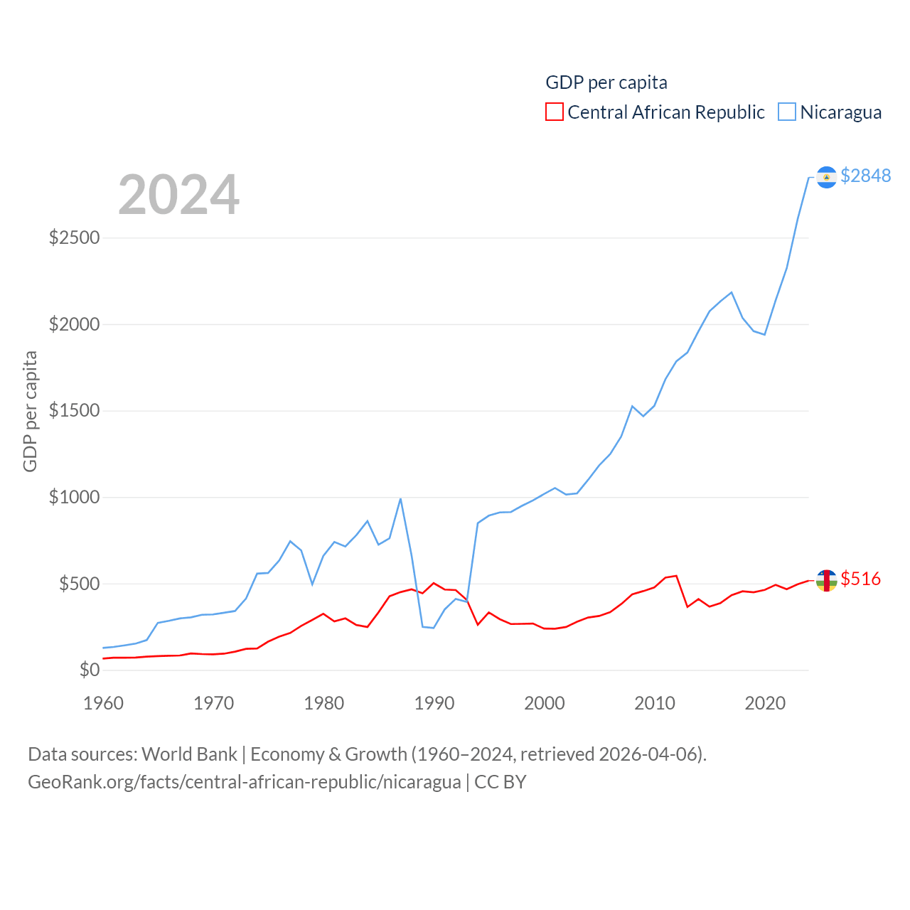 By GDP, The Central African Republic ranks 171/197 ($2.75B) and Nicaragua ranks 131/197 ($19.7B). By GDP per capita, The Central African Republic ranks 195/197 ($516), while Nicaragua ranks 141/197 ($2,848).